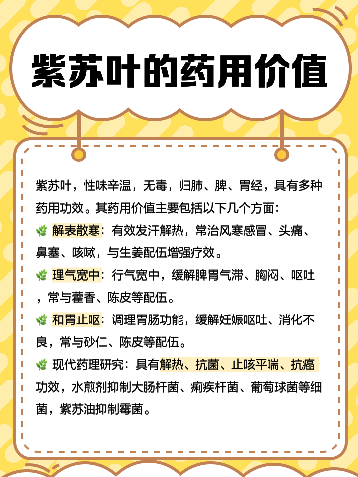 紫苏叶的功效与作用包括止血驱寒和解毒,吃法多样一功效与作用 止血紫苏叶具有很好的止血功效,但主要是外用当身体有伤口时,可将紫苏叶敷在伤口上,有助于止血并促进伤口更快结痂驱寒紫苏叶能驱散人体内的寒气,尤其适用于风寒感冒将其与生姜一同煮水后饮用,或将其放入热水中泡脚。