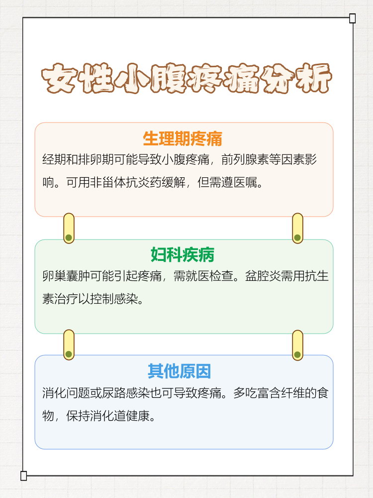 女性小腹两侧痛可能与多种因素相关,需结合症状和病史综合判断1 妇科疾病相关病因 排卵痛属生理现象,多发生于两次月经中间,因卵泡破裂及卵泡液刺激腹膜引发,通常持续数小时,疼痛轻微,不影响日常活动输卵管炎急性期表现为下腹剧痛坠胀感,伴尿频尿痛及脓血性分泌物慢性期以隐痛腰骶。