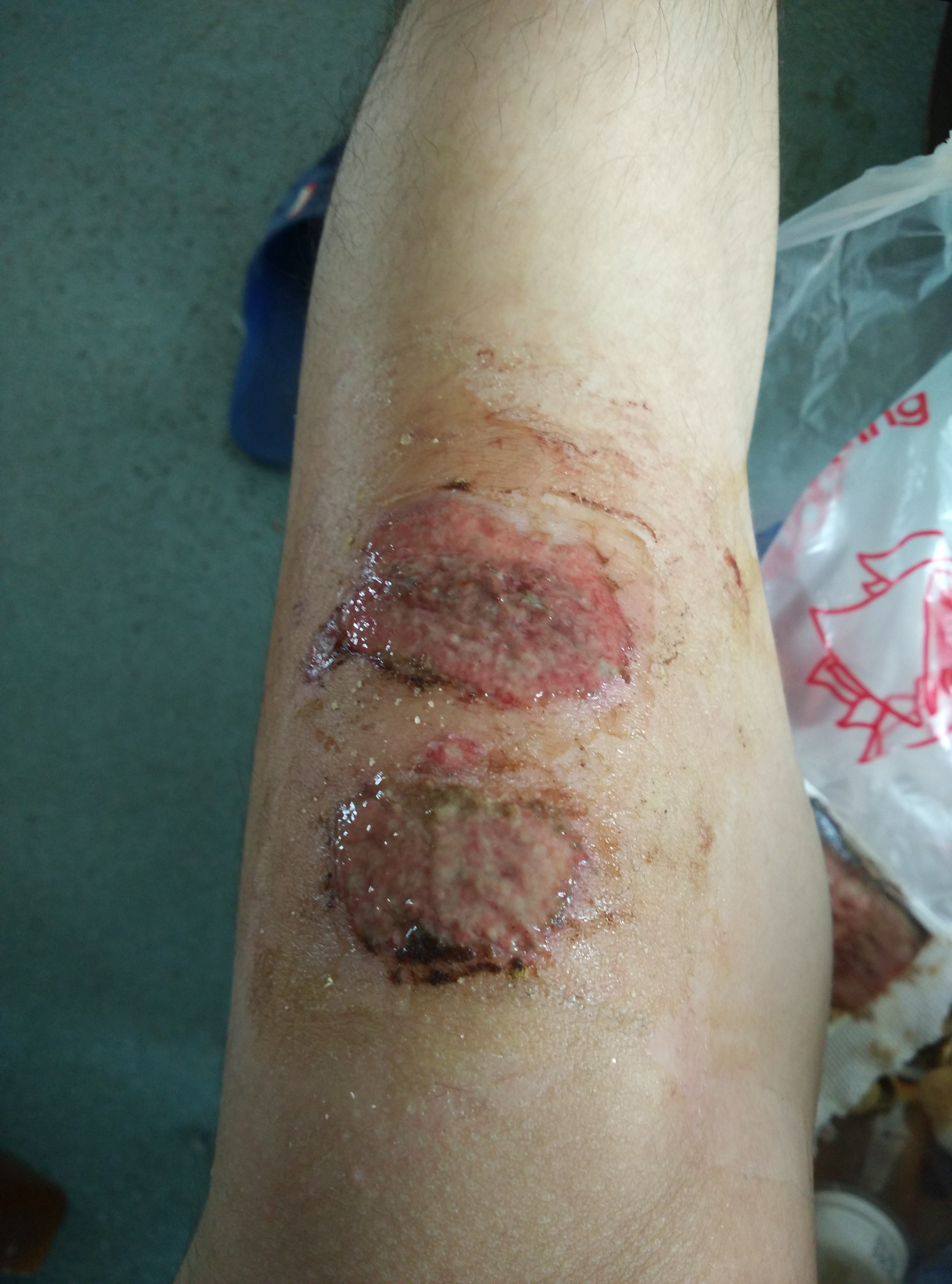 4、膝盖擦伤以后,皮下组织会有渗出,所以应当到医院用碘伏进行消毒,防止皮下组织出现细菌感染消毒以后,在表面用创可贴或者敷料覆盖上以后就可以了,注意后面几天尽量不要碰水,同时要减少膝盖的活动,如果活动以后,可能会导致表面结痂裂开如果是结痂下方有红肿或者有渗液流出来,需要及时的到医院换药。
