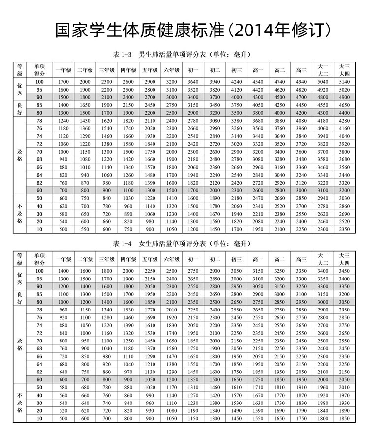 3、以下是肺活量体重指数评分标准,按性别和年级划分男生评分标准 小学五六年级 优秀100分 良好87分 及格72分 不及格50分 初中一年级至高中三年级 80, 79, 78, 76, 75, 74, 73, 72, 71, 70, 69, 68, 67, 66, 65, 64, 63, 62, 61, 60, 59, 58;1 根据国家学生体质健康标准,不同年级的学生肺活量及格标准有所不同2 四年级学生的肺活量在1100到1820毫升之间为及格,1900到2150毫升为良好,2400到2600毫升为优秀3 三年级学生的肺活量在900到1620毫升之间为及格,1700到1900毫升为良好,2100到2300毫升为优秀4 教育部要求各学校每学年对;大学生肺活量标准如下男大学生大一大二及格线为3100毫升,优秀线为5040毫升,即从及格到优秀的范围为40毫升大三大四及格线为3200毫升,优秀线为5140毫升,即从及格到优秀的范围为40毫升女大学生大一大二及格线为2000毫升,优秀线为3400毫升,即从及格到优秀的范围为;男生肺活量标准表大一,大二48005040毫升为优秀,43004550毫升为良好,31004180毫升为及格,23002940毫升为不及格大三,大四49005140毫升为优秀,44004650毫升为良好,32004280毫升为及格,23503030毫升为不及格肺活量是指在最大吸气后尽力呼气的气量包括潮气量补吸气量和补呼气量三;如果个人的肺活量低于相应年龄和性别标准的80%,这可能表明存在肺功能减退的情况肺活量减少可能与多种因素有关,包括胸膜增厚胸腔积液肺不张肺间质纤维化支气管哮喘慢性阻塞性肺疾病重症肌无力腹腔肿瘤或大量腹腔积液等疾病值得注意的是,肺活量会随着人的年龄增长而自然下降通常情况下。