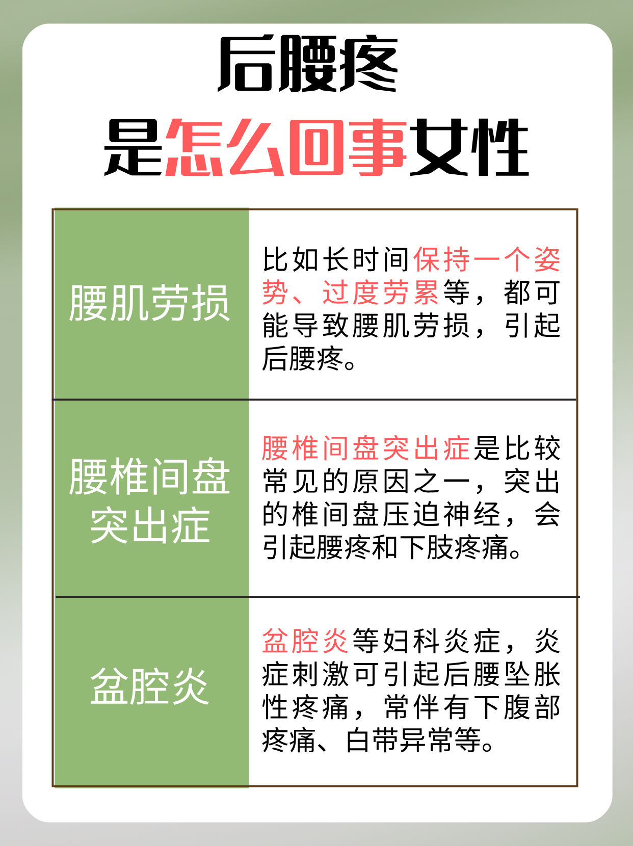 女性腰酸痛的原因主要有以下几点月经相关经期反应女性在来月经之前或月经期间,由于体内激素水平的变化,常会出现腰酸痛等不适症状月经结束后,这些症状通常会自行消失腰椎问题产后因素特别是生完小孩的妇女,可能由于产伤或其他原因,导致腰椎受损或功能下降,进而引发腰酸痛妇科疾病炎症性;女性左侧后腰隐隐作痛可能与以下原因有关,需结合症状及检查明确病因1 肾脏问题肾脏感染结石积水或肿瘤均可能引发左侧后腰疼痛,常伴随血尿尿频尿急等症状若出现此类症状,需及时进行肾脏超声或CT检查,以排除泌尿系统器质性疾病2 腰椎间盘突出腰椎间盘突出症可能导致左侧后腰疼痛,并向下肢。