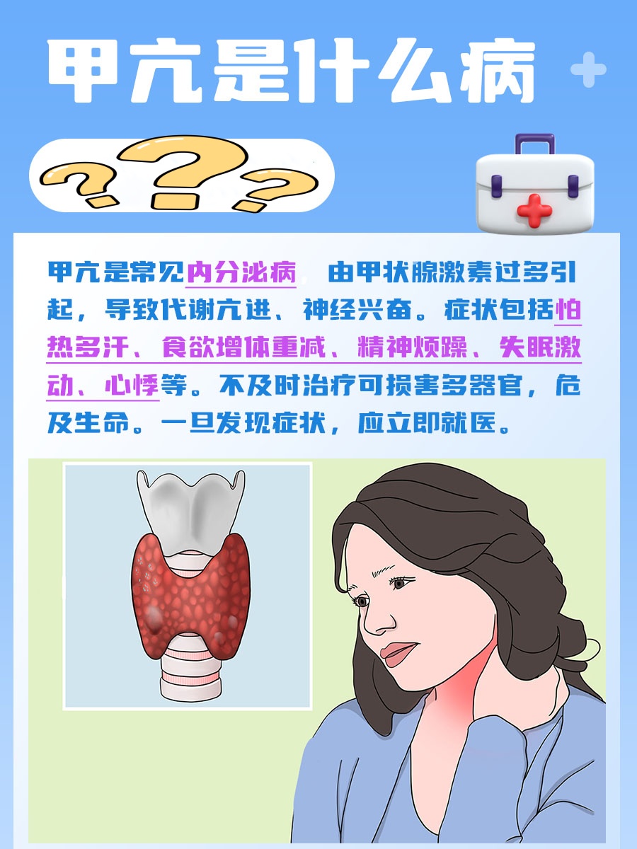 1、甲状腺功能亢进症是一种因血液循环中甲状腺激素过多,引起以代谢率增高和神经兴奋性增高为主要表现的综合征以下是关于甲状腺功能亢进症的详细解释临床表现心跳加速由于甲状腺激素对心脏的正性变时作用,甲亢患者常出现心跳加速代谢亢进表现为怕热多汗食欲亢进但消瘦,这是因为甲状腺激素促进了;甲状腺功能亢进症的发病原因主要包括以下几点自身免疫性疾病弥漫性毒性甲状腺肿是最常见的病因,约占甲亢患者的80%这是一种甲状腺自身免疫性疾病,导致甲状腺激素分泌过多炎性甲亢包括亚急性甲状腺炎无痛性甲状腺炎产后甲状腺炎和桥本甲亢等,这些炎症可能导致甲状腺激素的释放增加药物所致;手术治疗对于部分严重或药物治疗无效的患者,可考虑手术切除部分或全部甲状腺治疗周期与注意事项治疗周期一般为12年,期间不能突然停药,以免导致复发药物治疗期间需定期检查血常规肝脏功能等,以确保治疗安全有效综上所述,甲状腺亢进症是一种复杂的自身免疫性疾病,需要综合多种因素进行诊断和治疗患者应在医生的指导下进行治疗,并遵循医嘱进行定期复查和调整治疗方案;甲状腺功能亢进症,简称“甲亢”,是一种因甲状腺腺体本身产生过多甲状腺激素而引起的疾病以下是关于甲状腺功能亢进症的详细解释定义与成因甲亢是由于甲状腺分泌过多的甲状腺激素所导致的甲状腺是人体内负责生产甲状腺激素的腺体,用以调节身体的代谢和生长发育当甲状腺分泌激素过多时,就会引发甲亢;甲状腺机能亢进症是指各种病因造成甲状腺过量合成分泌大量的甲状腺激素的病症以下是关于甲状腺机能亢进症的详细解释1 病因 最常见的病因是弥漫性甲状腺肿伴甲亢 碘摄入过多也可以引起碘甲亢 甲状腺出现高功能的肿瘤,过量分泌甲状腺激素,也可以造成高功能腺瘤甲亢2 症状 代谢加快怕热。