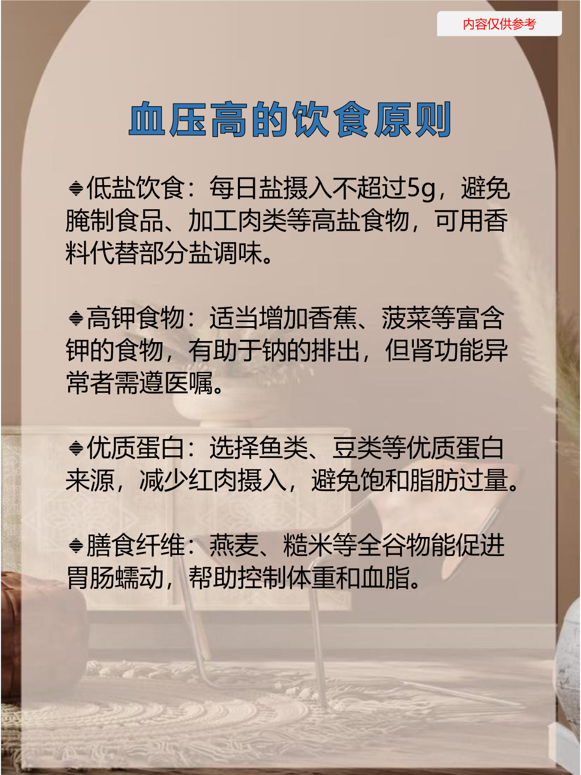 2、一生活方式调整1饮食控制每日钠盐摄入量需控制在6克以下,高盐饮食会导致水分潴留血容量增加,进而升高血压建议增加钾摄入,多吃香蕉菠菜土豆等富含钾的食物,促进钠排出同时保持低脂低糖高纤维的饮食结构,减少动物内脏油炸食品等饱和脂肪酸和胆固醇的摄入,控制糖分摄入以避免肥胖。
