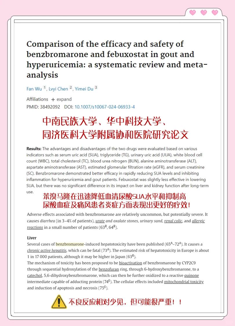 15、苯溴马隆是促进尿酸排泄的药,在过去常用来降尿酸治疗,但苯溴马隆副作用相对比较大,它主要是促进尿酸排泄,因此长期服用,最大的副作用是影响肾功能,会造成肾功能损伤另外,苯溴马隆长期服用,还会造成泌尿系结石以及肝功能受损对于本身已经存在肾功能不全泌尿系梗阻肾结石的患者,更不能应用苯。
