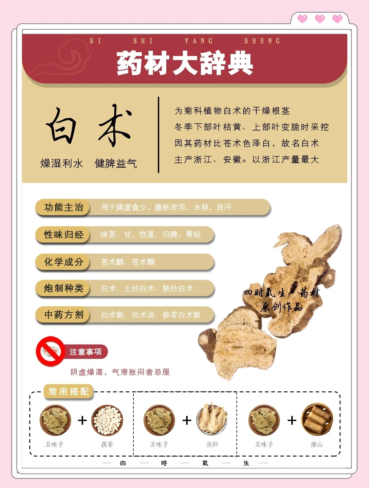 一功效1利尿消肿白术可促进体内多余水分排出,通过调节水液代谢,缓解因水湿停滞引起的水肿症状,尤其适用于脾虚湿盛型水肿2固表止汗其能增强体表卫气,减少异常汗液外泄,对自汗盗汗等体虚不固症状有改善作用3燥湿健脾通过燥湿作用改善脾脏功能,针对湿气内阻导致的脘腹胀满食欲不。