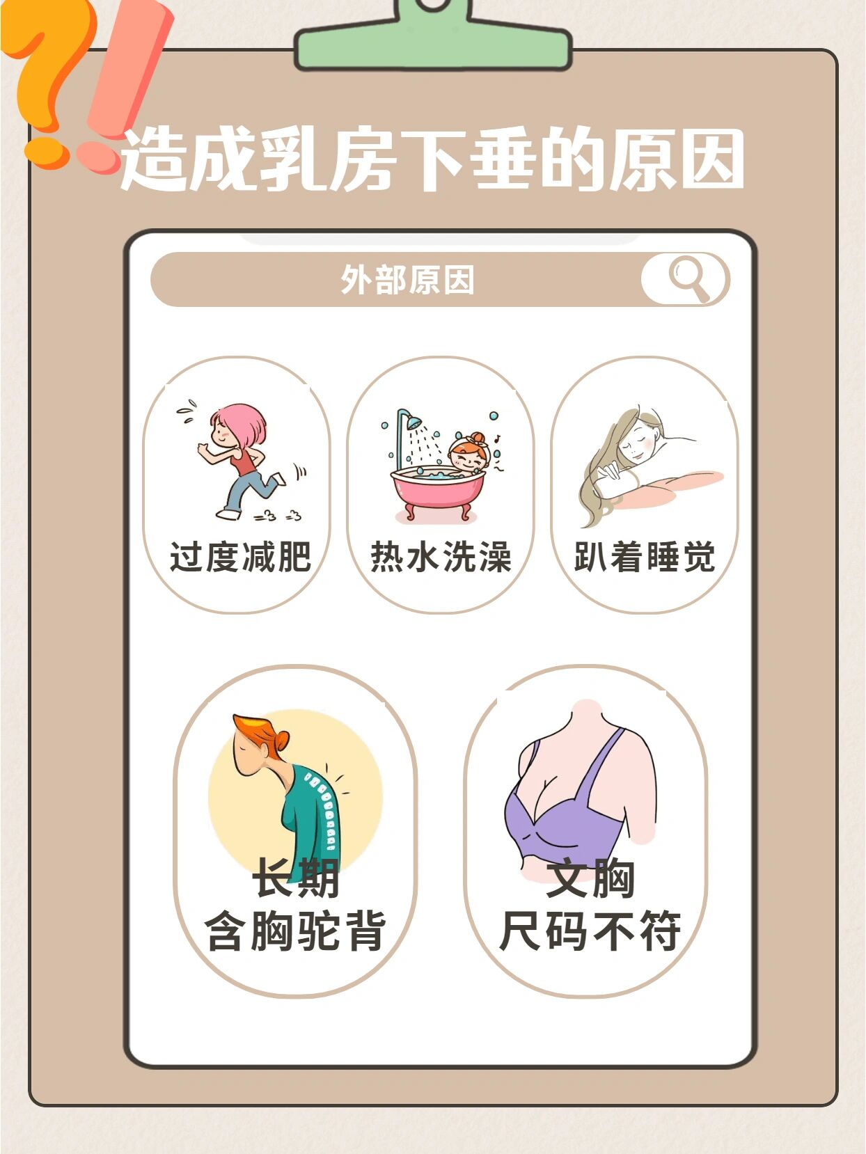内部原因哺乳导致乳房下垂一些产后妈妈停止哺乳后,激素水平降低,乳腺泡管腺体脂肪组织等发生萎缩,而皮肤及支撑组织相对较多,进而造成乳房下垂减肥造成乳房下垂减肥速度过快会使乳房内脂肪组织迅速减少,同时皮肤因来不及收缩而变得松弛,从而导致乳房下垂老年下垂随着年龄增长,人体各种机能逐渐。