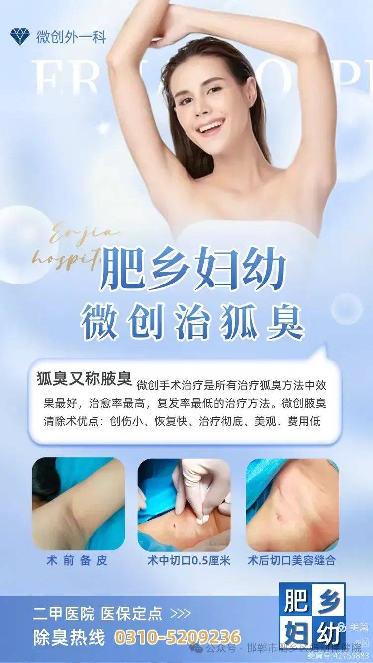 3、轻度腋臭症状若狐臭症状相对较轻,可通过门诊手术室进行微创手术治疗大致费用手术费用约1000元,加上术前检查及后期抗感染治疗,总费用大约在2000元重度腋臭症状或需住院治疗若腋臭症状严重,或患者身体条件较差不能耐受手术,可能需要考虑住院治疗大致费用总体费用会明显增多,大约在5000元左右。