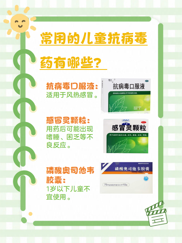 2抗感颗粒由金银花赤芍绵马贯众等中药组成,具有清热解毒功效,适用于外感风热引起的感冒该药物可改善发热头痛鼻塞喷嚏咽痛等症状,但需结合小儿年龄病情严重程度等因素调整用药方案西药类抗病毒药物1奥司他韦为神经氨酸酶抑制剂,对甲型和乙型流感病毒有抑制作用在流感发病48。