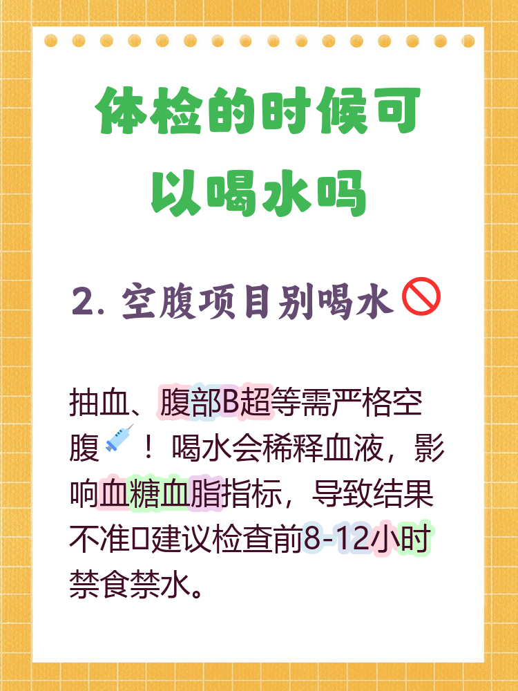 一体检前需保持空腹 体检之前通常需要空腹8~10个小时左右的时间,这是为了确保体检结果的准确性在空腹状态下,身体内的各项指标如血糖血脂等能更真实地反映身体的健康状况二喝水可能影响部分检查结果 化验检查喝水后,体内的水分会稀释血液,从而影响血糖血脂等化验指标的准确性肝胆彩超。
