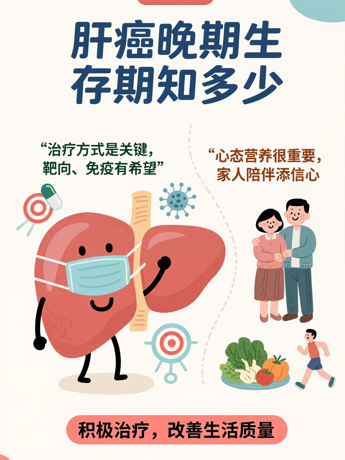 1、临床上并没有明确数据表明,肝癌晚期患者具体可以存活多长时间但根据临床经验分析,如果积极配合医生进行治疗,并且身体素质较好,则可能生存时间较长1积极治疗对于处于肝癌晚期阶段的人群而言,在确诊后需要及时采取针对性措施来改善病情,可遵医嘱通过化疗或放疗等方法来做处理,能够抑制体内肿瘤细胞;然而,这种情况相对少见极少数患者生存期较长虽然非常罕见,但有个别晚期肝癌患者可能通过有效的治疗和生活方式的调整,生存期超过三年甚至五年需要注意的是,晚期肝癌的治疗通常采用姑息性治疗,包括抗病毒治疗对症止痛治疗加强营养支持治疗等此外,还可以采用介入化疗射频消融治疗微波消融;晚期肝癌总体预后较差,如果患者不采取有效的治疗措施,预期生存时间通常只有几个月的寿命,甚至更短部分晚期肝癌患者如果肝功能尚可,还可以通过介入治疗,联合靶向药物治疗或者是免疫治疗,有可能延长晚期肝癌患者的生存时间目前靶向药物治疗联合免疫治疗,有可能将晚期肝癌患者由以往几个月的寿命延长到两年;这种疗法被认为是更安全更便宜更快速的细胞抗癌疗法晚期弥漫性肝癌患者接受NK细胞免疫疗法后,肿瘤缩小,生活质量显著提高一位男性患者被诊断为晚期弥漫性肝细胞癌,无法通过手术切除,且伴有肝炎冠心病支气管炎等慢性疾病在经过TACE和化疗治疗后,肿瘤未见明显缩小,反而导致身体状况极差专家。