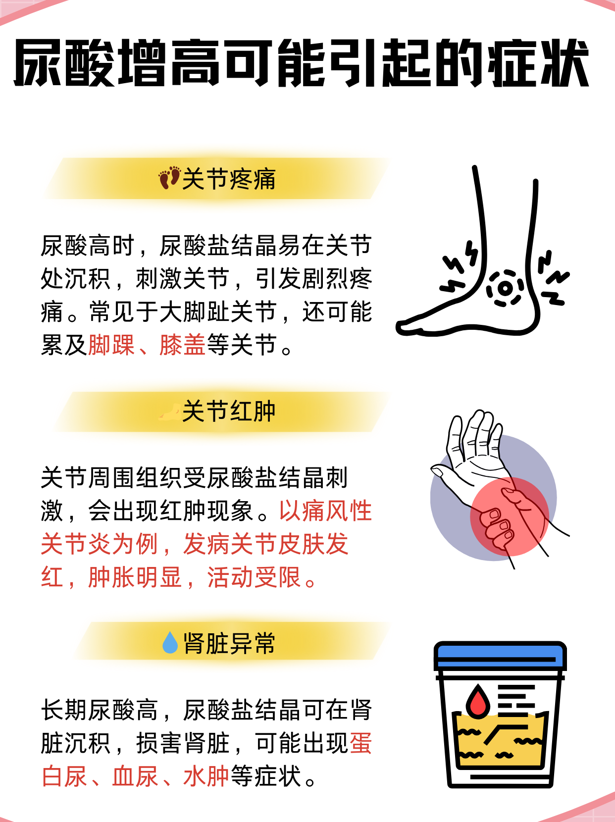 6、尿酸其实是人体内肌肉以及因为食物摄入而导致的各种排泄废物,体内尿酸高是指人体内的排泄废物代谢不出去肾脏出现疾病,肾小管滤过率降低,各种废物沉积在体内,尿酸容易和钙离子相互结合,形成各种结晶,沉积在患者低垂的身体部位,例如脚踝关节等一旦尿酸增高则很可能导致患者出现脚踝肿大疼痛的症状。