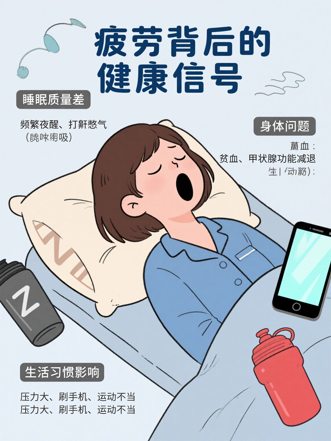 过度节食或饮食单一,可能导致血糖波动贫血等问题,直接引发疲倦建议保持荤素搭配,增加绿叶蔬菜水果全谷物的摄入,适量补充优质蛋白如鱼豆类,避免营养缺失睡眠质量差睡眠不足或睡眠深度不够会显著影响身体恢复能力,导致次日精神萎靡焦虑易怒例如长期熬夜会打乱生物钟,干扰阳气正常升。