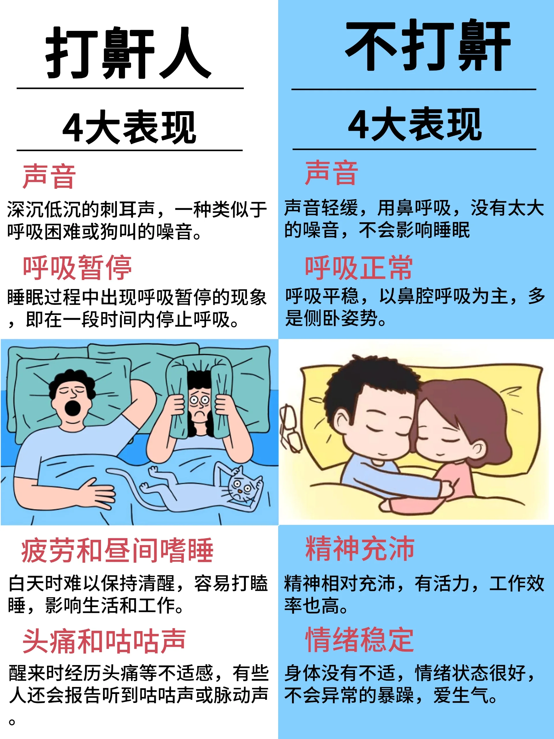 2、人在睡觉时打呼噜的原因主要包括以下方面气道狭窄是打呼噜最常见的原因之一当气道因鼻中隔偏曲鼻甲肥大腺样体或扁桃体肥大等问题变窄时,空气通过受阻,引发软组织振动,从而产生呼噜声此类结构异常可能由先天发育或后天炎症导致喉部结构异常也会影响气道通畅性例如,喉部软骨或肌肉松弛声带。