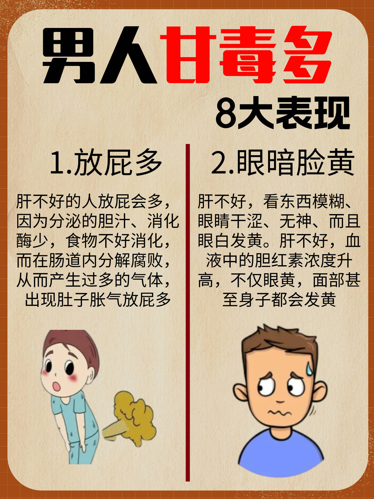 5、肝脏在人体中负责代谢,如碳水化合物蛋白质等物质的代谢都需要通过肝脏进行肝功能不好会导致体力明显下降,稍微活动就会感到疲倦,无法集中精神面色发黄肝脏异常可能导致胆道受阻,胆红素无法正常排泄,引起黄疸,表现为眼睛皮肤尿液等发黄有黄疸的人还可能出现全身性皮肤瘙痒鼻头发红肝脏功能;肝硬化后,胃也可能会受到影响,食管胃底出现静脉曲张这可能导致消化不良进食困难等症状激素代谢异常肝脏对激素的代谢有重要作用肝脏功能不好时,可能出现男性女性化等激素代谢异常的症状,如男性乳房发育等综上所述,肝不好的症状涉及多个方面,包括消化不良创面愈合困难凝血功能异常肝;肝不好的表现主要有以下几点消化系统症状长期食欲不振肝脏是人体的重要消化器官,功能不佳会影响消化功能,导致食欲不振恶心呕吐肝功能受损可能导致恶心呕吐等症状厌油腻对油腻食物失去食欲,是肝功能障碍的常见表现黄疸症状脸部眼睛巩膜发黄这可能是黄染的迹象,表明肝脏在胆汁生成。