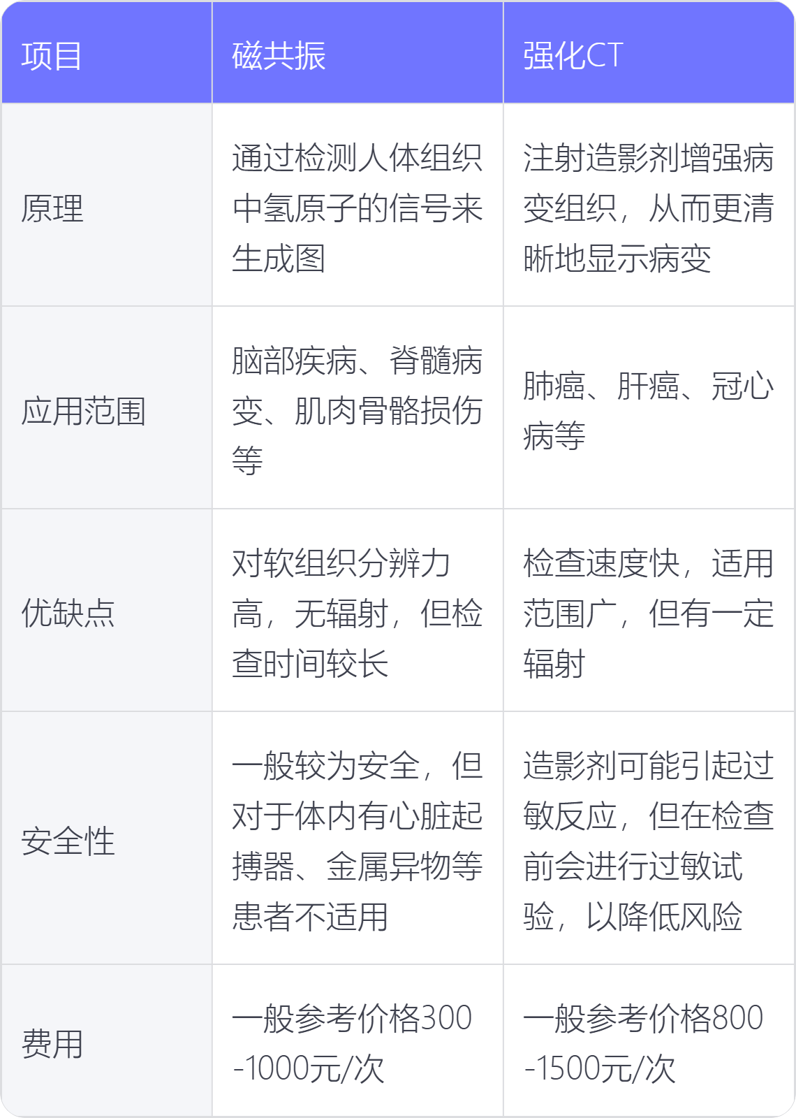 磁共振检查和CT的主要区别体现在成像原理辐射安全性成像特点以及临床应用上一成像原理磁共振成像MRI利用收集磁共振现象所产生的信号而重建图像的成像技术涉及原子核主要是氢原子核在磁场中的行为,通过射频脉冲激发原子核并检测其弛豫过程产生的信号来形成图像计算机断层扫描CT利;磁共振与CT不一样,它们之间的区别主要体现在以下几个方面原理不同磁共振利用磁场和射频波对人体进行成像,对人体没有辐射CT利用X射线对人体进行断层扫描,对人体有一定量的辐射扫描时间和价格不同磁共振扫描时间较长,价格相对较高CT扫描时间短,价格相对较低检查优势不同CT。