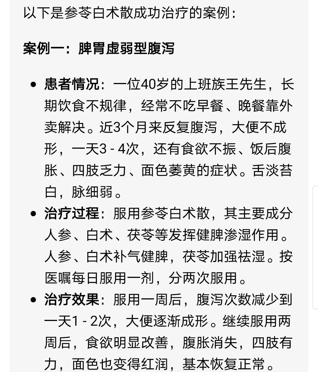 参苓白术散的功效与作用 参苓白术散源于宋太平惠民和剂局方,药性平和,温而不燥,是治疗脾虚湿盛泄泻的经典方剂其功效为健脾益气,主治脾胃虚弱食少便溏倦怠乏力中医认为脾为“后天之本”,脾胃虚弱会导致食少腹胀大便溏泄等症状,而参苓白术散通过益气健脾渗湿止泻,改善脾虚湿盛的;1健脾益胃参苓白术散中含有人参白术山药等成分,这些药材能够增强脾胃功能,提高消化吸收能力对于脾胃虚弱食欲不振消化不良等症状,该方剂可通过调理脾胃气机,改善运化功能,从而缓解相关不适2益气补中方剂中的黄芪党参等药材具有益气补中的功效,能够提升机体气血水平,增强免疫力对于因脾。