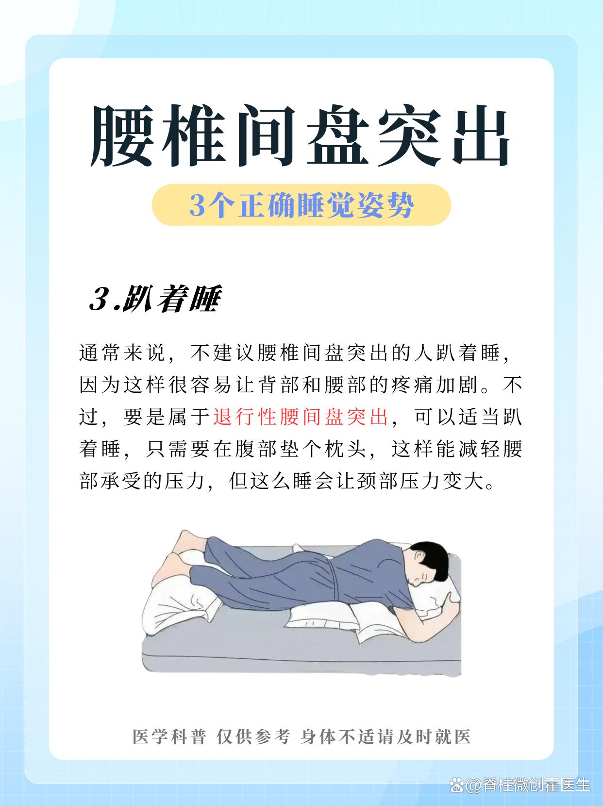 11、适合腰椎间盘突出症的睡姿主要为侧卧位,具体分析如下侧卧位是较为推荐的睡姿人体脊柱天然存在一定弧度,平躺时脊柱可能因身体压力而变直,导致腰椎间盘承受异常应力,不利于病情恢复而侧卧时,脊柱可保持自然弯曲状态,有助于分散腰椎压力,减少对椎间盘的刺激建议选择右侧卧或左侧卧,并在双腿间。