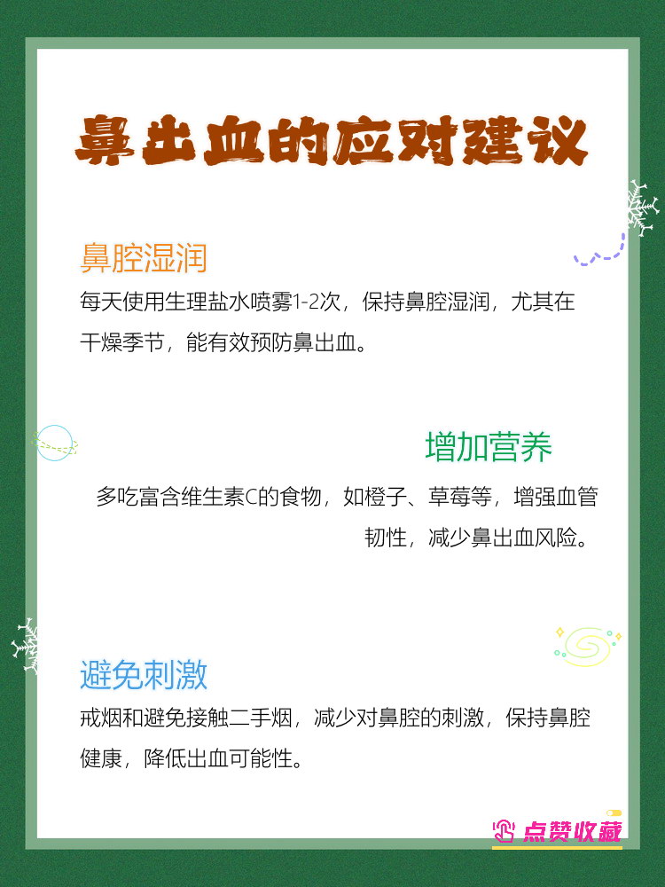 突然流鼻血且无明显征兆,可能由以下原因引起一常见病因1鼻部损伤外力撞击挖鼻或用力擤鼻等行为可能损伤鼻黏膜,导致出血2鼻部炎症鼻炎鼻窦炎等疾病会引起鼻黏膜充血肿胀,黏膜脆弱时易破裂出血3鼻中隔偏曲鼻中隔向一侧弯曲时,突出的黏膜因长期受气流冲击而糜烂,引发出血4;突然毫无征兆流鼻血的处理与预防方法如下一可能原因突然流鼻血可能与以下因素相关1鼻腔前部血管破裂最常见原因,干燥环境鼻炎鼻中隔偏曲或外伤如挖鼻擤鼻可能导致鼻黏膜血管破裂2高血压血压升高时,鼻腔血管压力增大,易引发出血3血液疾病血小板减少症白血病等凝血功能;鼻腔鼻窦炎症包括感染性过敏性疾病,这些疾病可能导致鼻黏膜充血水肿,甚至糜烂破溃出血 鼻中隔偏曲鼻中隔明显偏曲可能损伤鼻黏膜,导致流鼻血 鼻腔内增生物如息肉乳头状瘤等,这些增生物可能刺激鼻黏膜,引发出血全身性疾病的征兆 血压升高血压明显升高可能导致鼻腔血管破裂;突然流鼻血的常见征兆及原因如下鼻腔干燥当鼻腔黏膜因环境干燥如空调房冬季干燥气候或饮水不足而缺水时,黏膜脆性增加,血管易破裂出血频繁擤鼻或挖鼻用力擤鼻反复挖鼻或揉鼻会直接损伤鼻腔黏膜,导致局部血管破裂,尤其儿童因鼻腔结构敏感更易发生鼻部创伤外力撞击如碰撞跌倒或。
