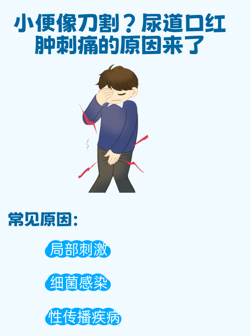 1 尿路感染最常见的病因是尿路感染,包括尿道炎和膀胱炎细菌感染尿道或膀胱后,会引发炎症反应,导致排尿时或排尿后出现刺痛灼热感,可能伴随尿频尿急尿液浑浊或血尿等症状女性因尿道较短,更易发生此类感染2 前列腺炎男性前列腺发炎时,炎症可能刺激尿道,引发排尿疼痛,尤其是排尿结束后;尿道结石尿道内存在结石时,排尿过程中结石移动会刮伤尿道黏膜,引发刺痛结石大小和位置不同,疼痛程度有所差异,严重时可能出现血尿例如,膀胱结石在排尿时可能卡在尿道狭窄处,造成剧烈刺痛前列腺炎男性前列腺炎症会刺激前列腺和尿道,导致排尿后尿道刺痛,可能伴随会阴部下腹部坠胀不适例如;排尿后尿道口疼痛可能由以下原因引起尿道口的感染症状尿道口黏膜充血水肿,伴有粘膜糜烂表现排尿时可出现小便疼痛,排完尿后出现局部刺痛等症状治疗需要进行局部的抗感染治疗男性包皮或龟头炎症状包皮龟头红肿,可能累及尿道口,导致局部红肿糜烂表现排尿时尿道口疼痛,或排尿后出现局部刺痛治疗需针对。
