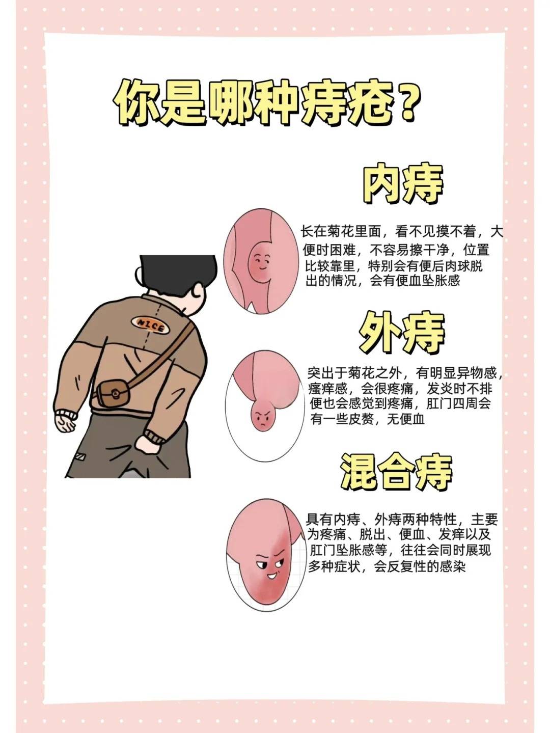 如果外痔感染并肿胀,就会引起明显的疼痛肛门脱出这是内痔的主要症状之一肛门突起时,患者会有异物感早期内痔可能无明显特征,需通过科学仪器才能观察到排便时用力过大,腹部产生重大压力,容易导致内痔脱出于肛门外情节严重者,一些简单的正常活动也可能导致痔核脱出于肛门外潮湿和瘙痒如果。
