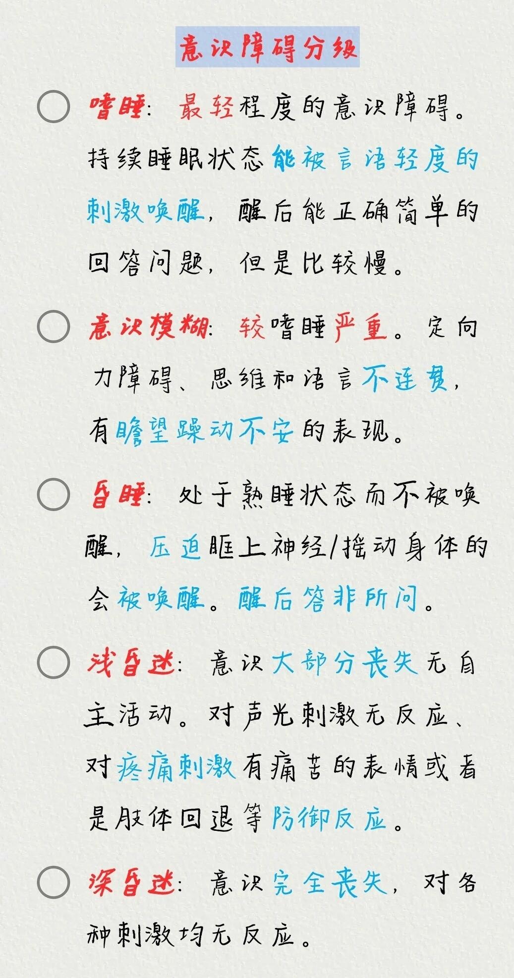 意识状态的分级和表现如下一常规意识障碍分级 嗜睡表现睡眠明显增多,容易被唤醒,唤醒后可正常交谈和进行日常活动昏睡表现睡眠时间明显增加,不易被唤醒,唤醒后只能简单对话并迅速入睡,基本无法进行主动性意识活动浅昏迷表现意识完全丧失,不能被唤醒,但对有害刺激有逃避反射,存在不。