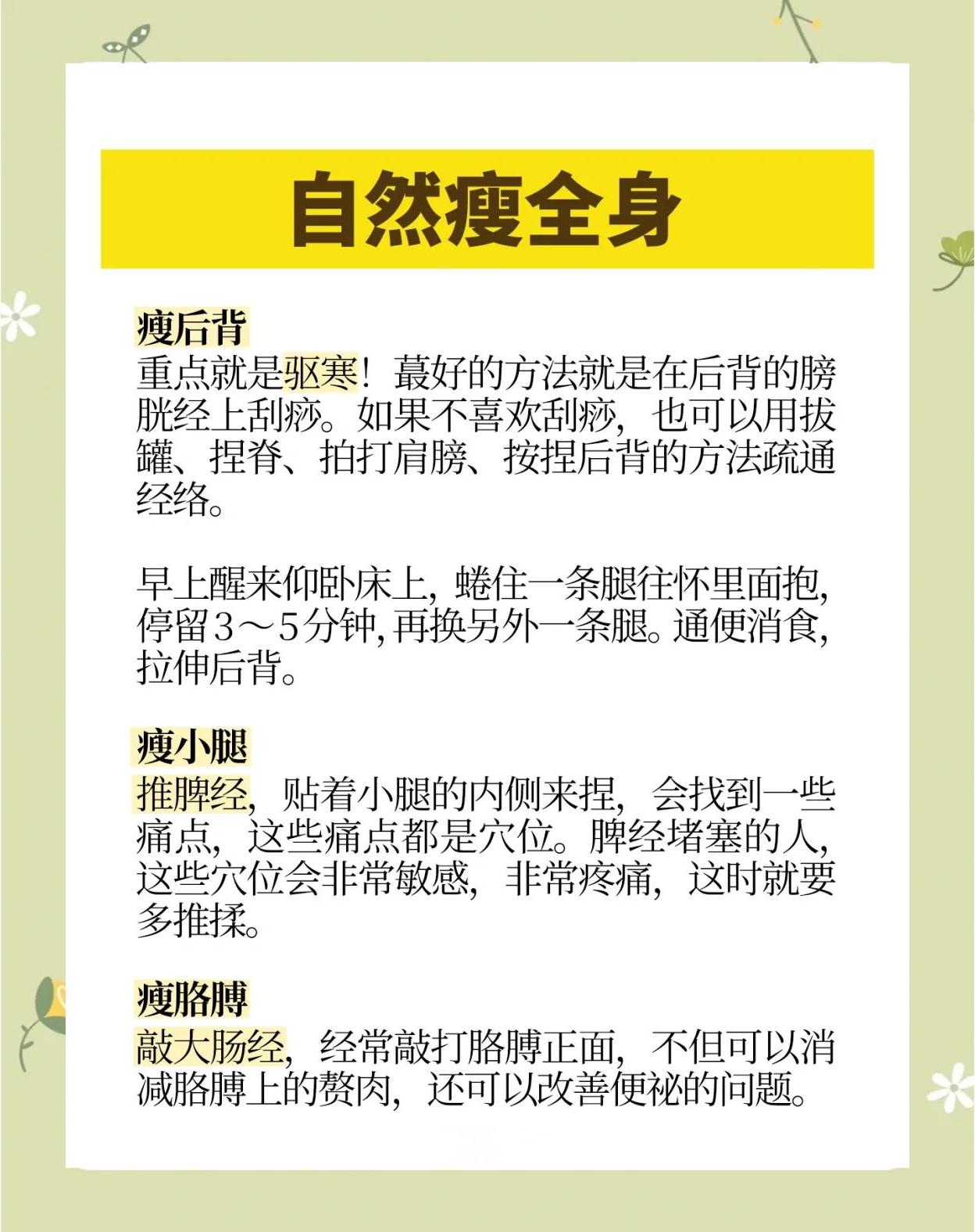 保持正常作息早睡早起,尽量在11点之前睡觉,保证充足睡眠规律饮食一定要吃早饭,建议在8点左右吃早餐长期坚持健康的饮食与运动习惯,一般半年到一年就能看到较好的减肥效果综上所述,减肥瘦全身需要综合运用科学的饮食控制合理的运动安排以及良好的生活习惯,并长期坚持下来。
