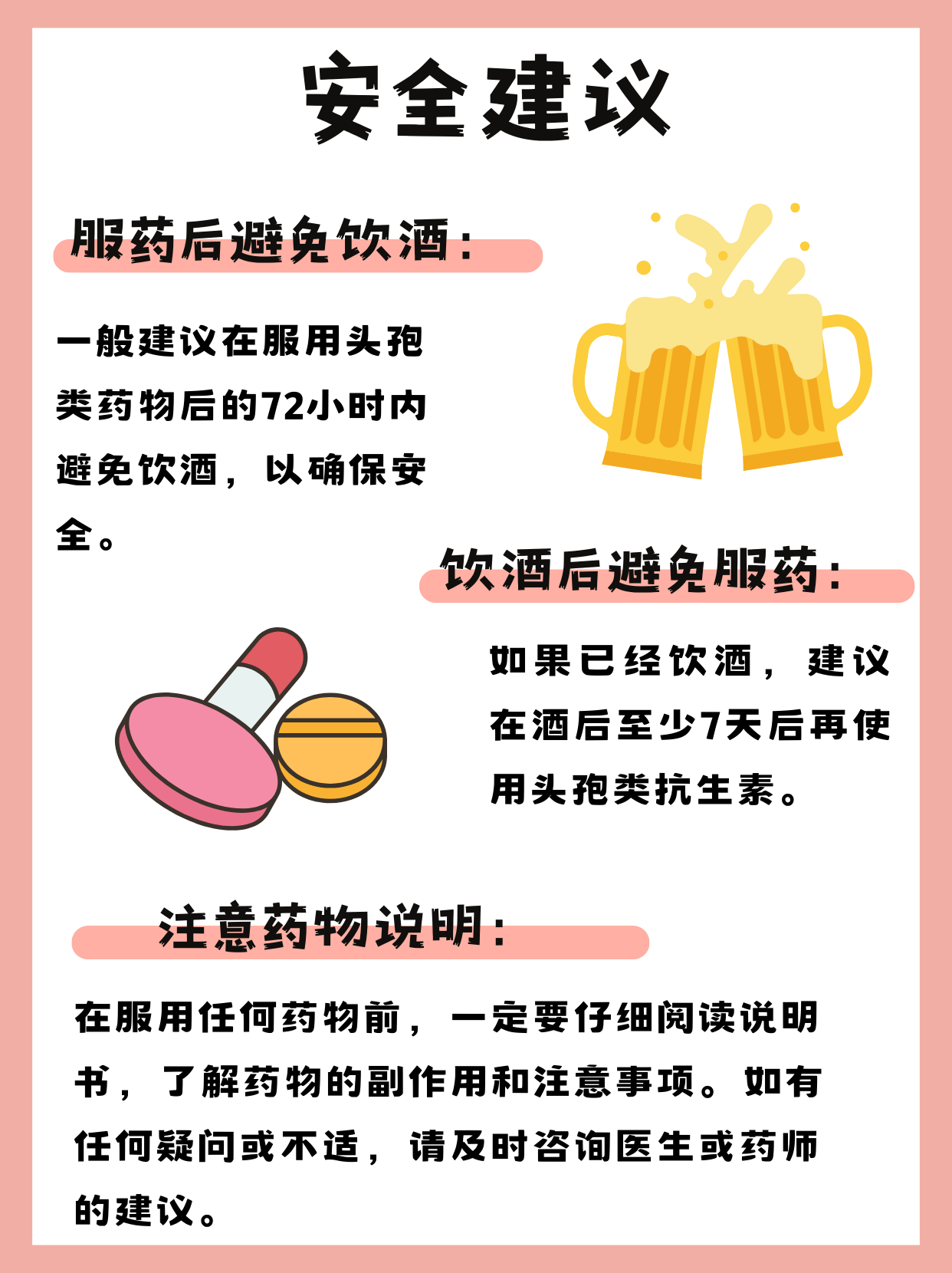服用头孢类药物后,建议至少7天内避免饮酒双硫仑样反应的机制与风险头孢类药物会抑制乙醛脱氢酶活性,导致饮酒后乙醛在体内蓄积,引发双硫仑样反应此反应与药物剂量和饮酒量无关,即使少量酒精也可能导致严重后果,包括面部潮红结膜充血视物模糊头颈部血管剧烈疼痛头晕恶心呕吐出汗口干。