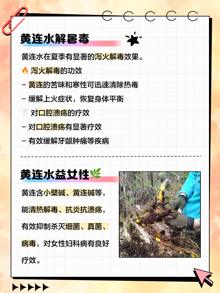 黄连具有清热解毒的作用,上火严重时,可将其泡水,一天饮用三次,效果会比较明显对于人体腹泻腹痛等症状,饮用黄连水具有很好的缓解效果用黄连来泡水喝还可以缓解口腔溃疡长痘等上火的症状饮用期间的饮食需要清淡,多食用富含维生素c的瓜果蔬菜不建议频繁饮用黄连水,避免损伤脾胃黄连泡水时。