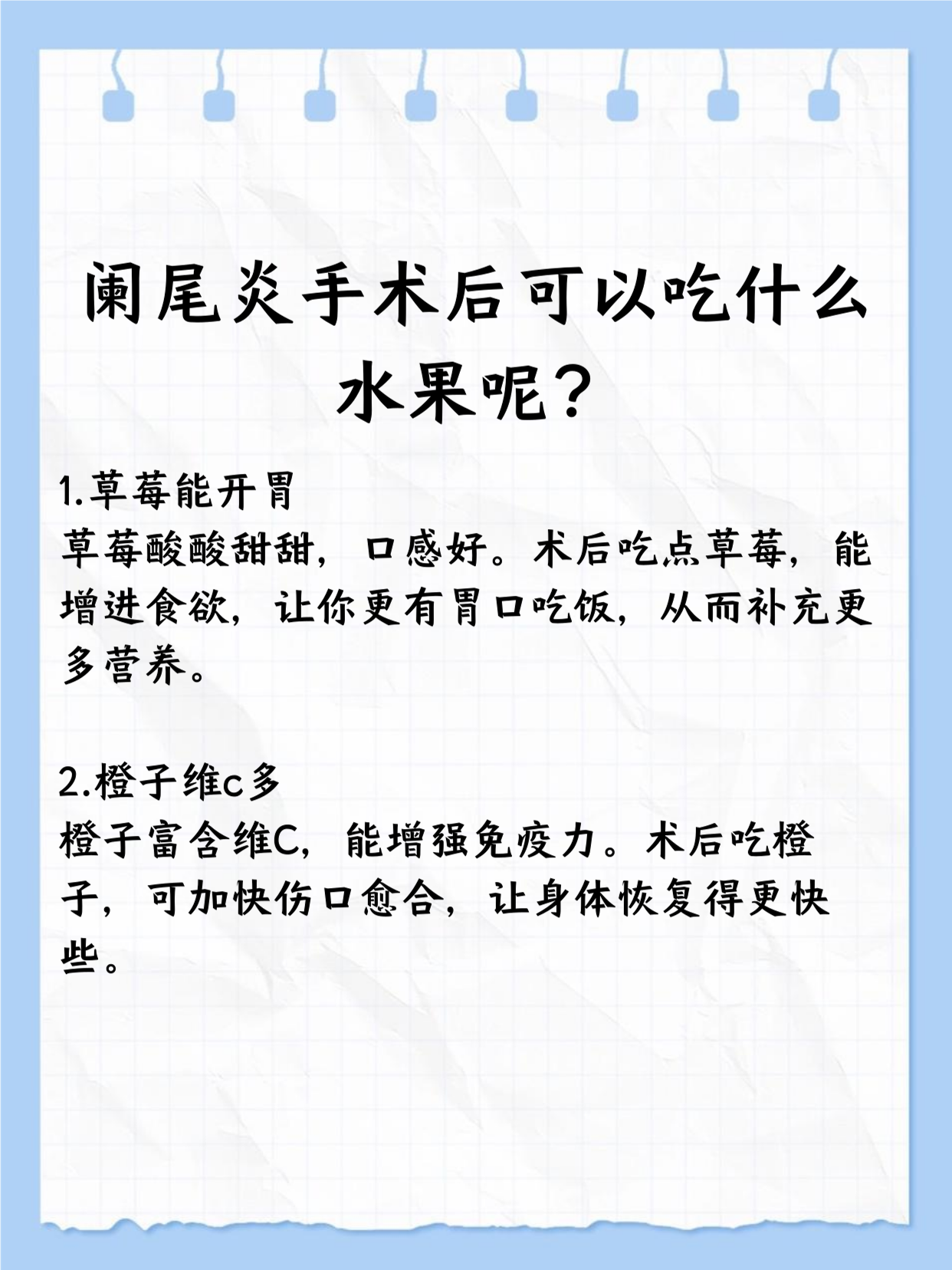 3、阑尾炎手术后可以吃的食物根据术后恢复情况分为以下几个阶段一初期 温水排气后可以少量饮用温水,以观察胃肠道反应 粥类如小米粥玉米粥大米粥黑米粥等软糯易消化的食物 鸡蛋糕作为初期恢复的食物选择,易于消化注意避免进食牛奶豆浆等看似流食但不易消化的食物,以免增加胃肠;阑尾炎手术一周后,患者可以吃以下食物,但具体还需根据病情决定半流质食物如果患者肛门已经完全排气排便,且腹部没有明显的压痛反跳痛,可以开始尝试半流质饮食,如稀饭和面条等清淡饮食阑尾炎手术后的饮食应以清淡为主,避免油腻和刺激性的食物,以免对肠道造成负担禁食情况如果阑尾的炎症;稀软的面食如面条面片馒头花卷等,这些食物易于消化,不会给肠道带来过重的负担有营养的汤类如鱼汤和鸡蛋汤等,它们能提供优质蛋白和氨基酸,有助于阑尾炎术后切口的愈合新鲜的蔬菜和水果蔬菜应以膳食纤维和粗纤维食物为主,如芹菜韭菜菠菜萝卜等,这些食物有助于促进肠道蠕动;阑尾炎手术后六天,患者通常可以恢复正常饮食,但需注意食物选择以促进恢复首先,应优先摄入高蛋白食物牛奶鸡蛋瘦肉如鸡肉鱼肉等富含优质蛋白,能够为身体提供修复组织所需的氨基酸,加速伤口愈合,增强免疫力例如,每日可饮用一杯牛奶约250ml,或食用一个水煮蛋,搭配适量瘦肉其次,需;恢复正常排便后可进食软食,此时的饮食应与平常相似,但应更加软烂易消化建议增加蛋白质的摄入,如鸡蛋牛奶瘦肉等,这些食物有助于手术后的恢复术后一周通常可恢复到完全正常的饮食但仍需注意避免过于油腻辛辣或刺激性的食物,以免对胃肠道造成不良影响总之,阑尾炎手术后的饮食应以;1 优先选择富含优质蛋白质的食物蛋白质是术后组织修复的核心营养素推荐食用鱼鸡肉豆腐鸡蛋等低脂高蛋白食物,可促进伤口愈合及免疫力恢复例如,清蒸鱼或水煮鸡胸肉既能提供充足蛋白,又避免加重消化负担2 补充维生素与矿物质术后身体代谢加快,需通过新鲜蔬菜如菠菜胡萝卜水果如;排便,对于微创阑尾炎术后的恢复有一定效果可以尽量多吃新鲜的水果,包括苹果香蕉橘子猕猴桃,这些新鲜的水果当中含有大量的维生素C和微量元素,对于促进微创阑尾炎手术切口的愈合,以及提高患者的抗病能力和增强机体免疫力,都是有好处的,饮食上避免吃辛辣刺激性的食物,应该以少量多餐为主。