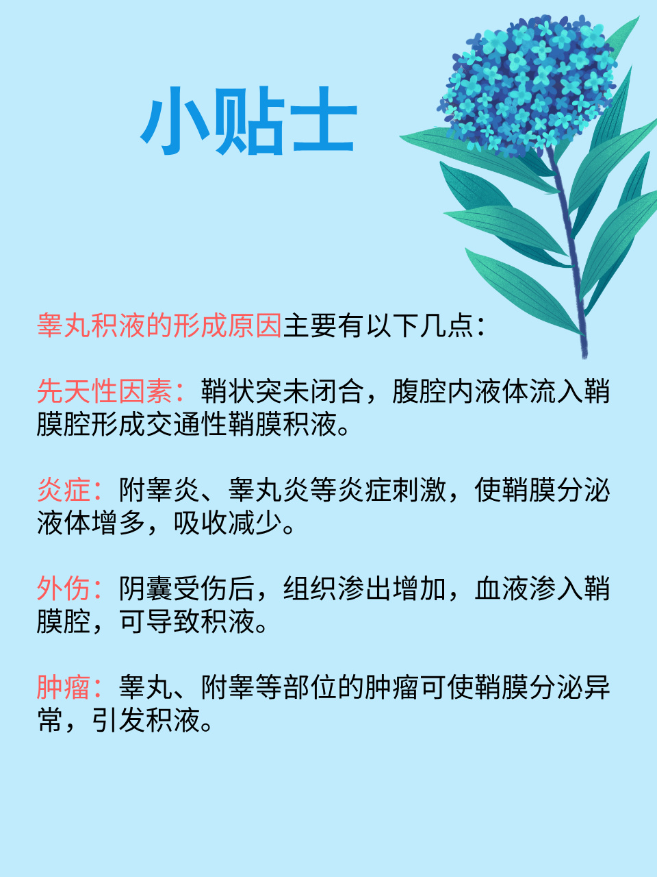 病因目前尚不完全明确,但与先天及后天因素相关先天因素包括鞘状突未完全闭合导致腹膜腔与鞘膜腔相通或鞘膜腔液分泌过多吸收减少后天因素则涉及炎症如附睾炎创伤阴囊外伤肿瘤睾丸或附睾肿瘤等刺激鞘膜分泌增加,或淋巴回流受阻导致积液症状典型表现为阴囊内无痛性囊性肿块。