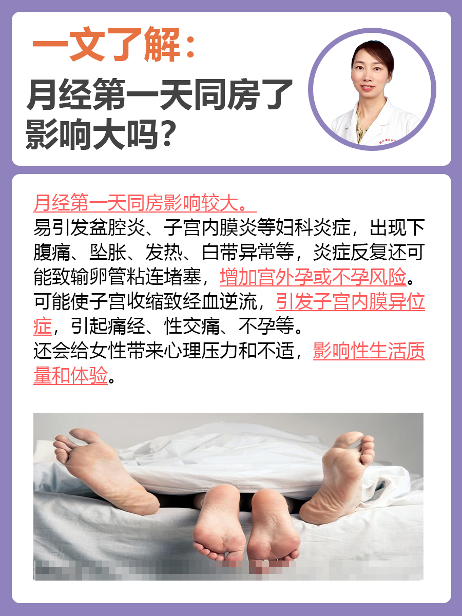 1、其实这种事,要么就没有任何事情,要么就会发痒难过严重得要去医院,是两个极端来着,而且,还应注意月经期即使使用避孕套也不能进行性交,因为避孕套只能阻止精子进入阴道,但不能防止把细菌带入阴道,所以,这样做也是有害的应该在确认月经干净后再性交 MA,反正就一次两次的是不会有什么问题的;来月经第一天同房主要存在以下问题1 感染风险显著增加月经期间,子宫内膜处于剥脱出血状态,宫颈口开放,阴道自净能力下降此时同房可能将外界细菌如阴道阴茎或手部的病原体带入宫腔,引发子宫内膜炎附件炎盆腔炎等妇科炎症这些炎症若未及时治疗,可能发展为慢性疼痛输卵管粘连,甚至导致不孕;来例假第一天不可以同房以下是具体原因机体抵抗力低下来月经期间,女性的机体抵抗力相对较低,此时同房容易引发感染宫颈内口开放月经期间,宫颈内口处于开放状态,子宫与外界相通,子宫的保护屏障消失,增加了感染的风险感染风险大月经期同房可能导致上行感染,不仅感染阴道,还可能感染宫颈以及。