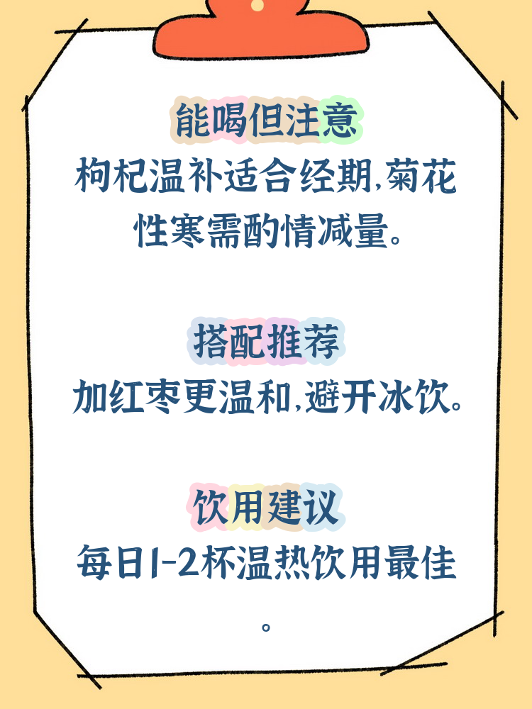 12、经期可以适量饮用枸杞茶,但需结合个体情况并注意以下要点枸杞茶的潜在益处枸杞茶含有枸杞多糖类胡萝卜素维生素C维生素E等成分,具有抗氧化抗炎和免疫调节作用从中医角度,枸杞可滋补肝肾调理气血,可能缓解经期因失血导致的肝肾阴虚疲劳及气血运行不畅等问题其抗氧化特性还能减轻经期氧化。