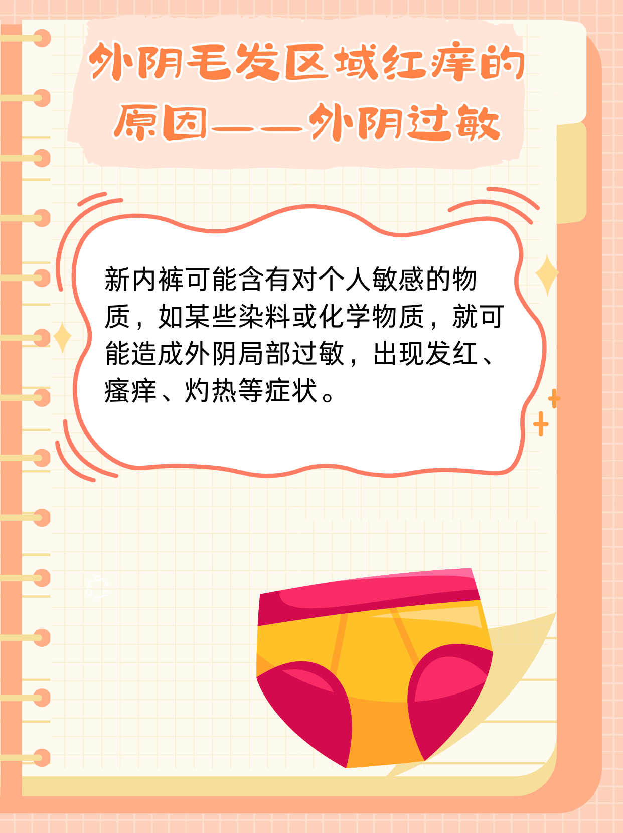 4、2 过敏反应卫生巾内裤材质洗涤剂或化妆品可能引发过敏首要措施是脱离过敏原更换纯棉内裤无香型卫生巾,使用温和洗涤剂若瘙痒严重,可短期使用抗组胺药如氯雷他定缓解症状,但需避免长期依赖3 皮肤疾病湿疹银屑病扁平苔藓等皮肤病可能累及外阴治疗需根据疾病类型湿疹可用低效糖。
