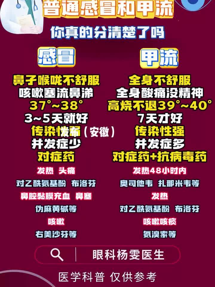 普通感冒与流感存在多方面区别,主要体现在病原体传染性传播速度及病程等方面病原体差异普通感冒主要由呼吸道合胞病毒鼻病毒冠状病毒等引起,这些病毒类型多样且致病力相对较弱流感则由流感病毒包括甲型乙型丙型引发,病毒结构复杂且变异频繁,尤其是甲型流感病毒易引发大规模流行传;及时使用抗流感病毒药物治疗效果较好这样能有效减轻症状,缩短病程,避免病情进一步发展引发并发症4 **传染性不同**普通感冒的传染性相对较弱,一般在家庭等小范围内传播流感的传染性强很多,传播速度快,容易在学校工厂社区等人员密集的场所迅速传播,导致较大范围的人群感染发病;1 病原体不同流感是由流感病毒引起的一种急性呼吸道传染性疾病,流感病毒是其特定的病原体普通感冒则是由多种病毒引起的常见急性上呼吸道感染性疾病,其病原体包括但不限于冠状病毒呼吸道合胞病毒副流感病毒等2 症状表现有差异流感起病较急,常见症状包括高热,腋下体温可达39;高危人群范围两类疾病的高危人群均包括儿童老年人孕妇及患有基础疾病者,但流感因传播性强并发症风险高,还将医务人员免疫功能低下者等纳入高危范畴治疗方法区别普通感冒以对症治疗为主,通过休息多饮水使用解热镇痛药缓解症状,通常57天可自愈流感需在发病48小时内使用抗病毒药物。