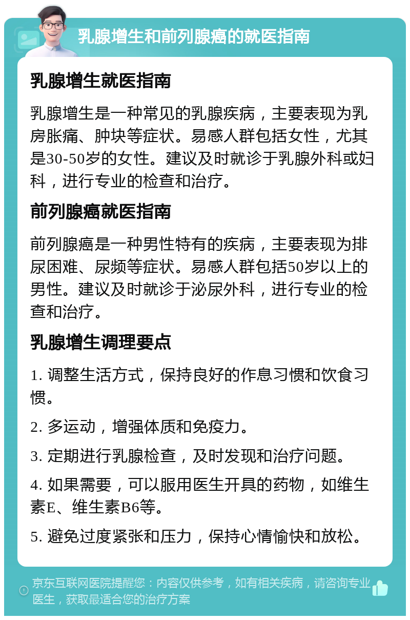 普通外科在部分规模较小的医院中,可能未设立独立的乳腺外科,此时乳腺疾病患者可选择普通外科就诊普外科的诊疗范围广泛,除手术外,还可通过药物治疗放射治疗等方式处理乳腺问题其优势在于多学科协作能力,但专业性可能略逊于乳腺外科内分泌科主要针对内分泌失调引发的乳腺问题,如乳腺增生等若怀疑;乳腺科或乳腺外科在没有专门的乳腺专科的情况下,乳腺科或乳腺外科也是很好的选择,这些科室的医生同样具备处理乳腺增生等乳腺疾病的专业知识和经验普外科在部分地区或医院,如果没有专门的乳腺科室,可以选择挂普外科的号普外科医生对于乳腺增生的诊断和治疗也具备一定的知识和经验中医科室除了;得了乳腺增生结节,可以挂以下科室的号普通外科这是乳腺疾病的主要科室之一,能够对乳腺增生结节进行初步的诊断和治疗乳腺外科这个科室专注于乳腺疾病的诊断和治疗,对于乳腺增生结节的处理更加专业和细致病理科当对乳腺增生结节的病变性质不明确时,可以考虑挂病理科进行病理学穿刺通过穿刺活检;男性乳腺增生可以挂的科室主要包括乳腺外科首选科室如果男性乳腺增生形成了明显的肿块,建议首选乳腺外科治疗方法乳腺过度增生形成的肿大肿块,可能需要进行外科手术切除以达到彻底治愈的目的普外科适用情况在没有专门的乳腺外科的情况下,也可以选择普外科就诊治疗方法普外科医生同样具备处理。