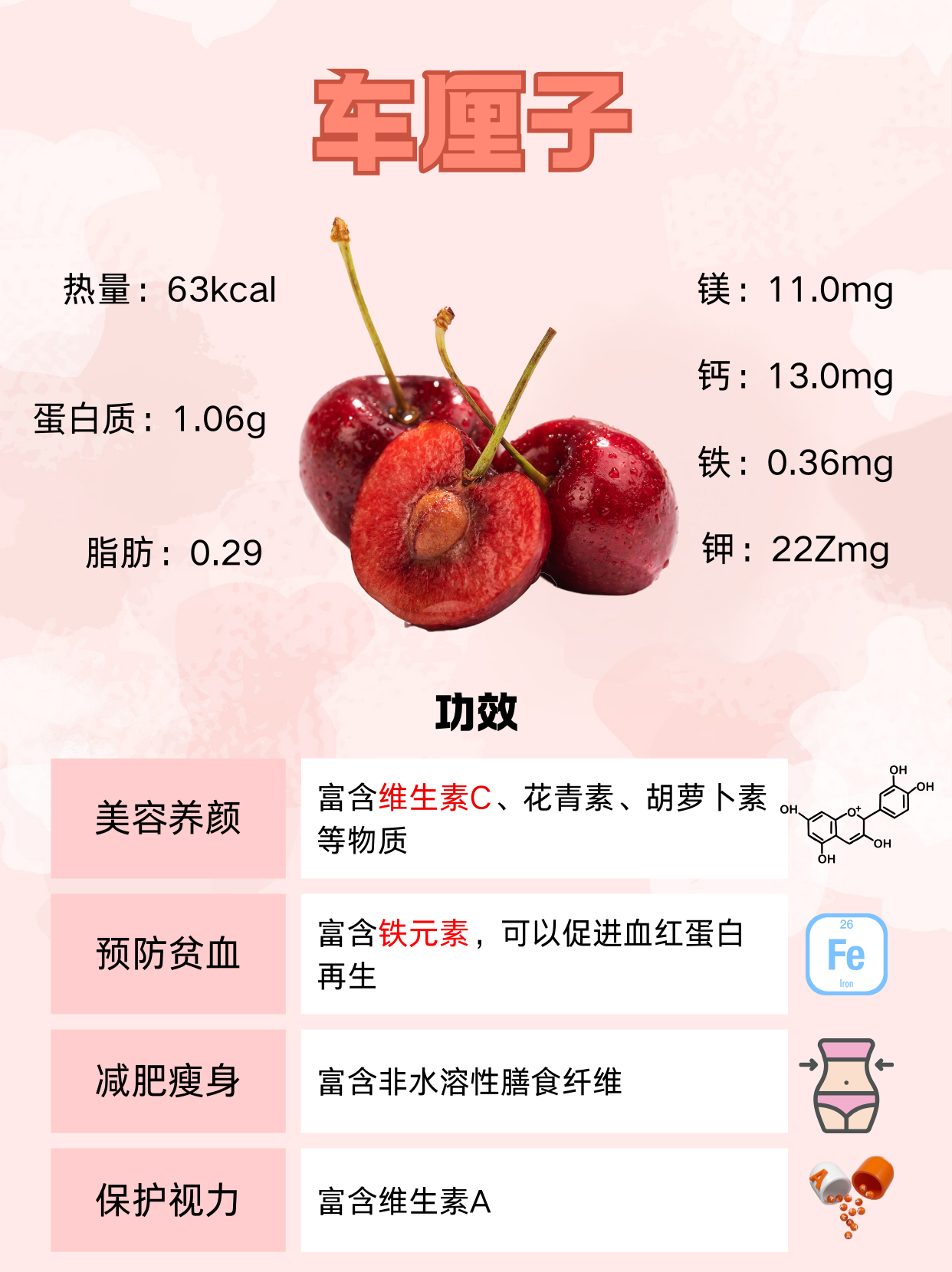 4、樱桃的作用功效及营养价值如下一作用功效1补铁樱桃含铁元素,是人体合成血红蛋白和肌红蛋白的关键成分缺铁人群食用可辅助改善贫血症状,尤其适合生理期女性或术后恢复者2补充营养樱桃含脂肪蛋白质碳水化合物等宏量营养素,可快速补充能量,适合体质虚弱或运动后恢复人群3抗氧化。