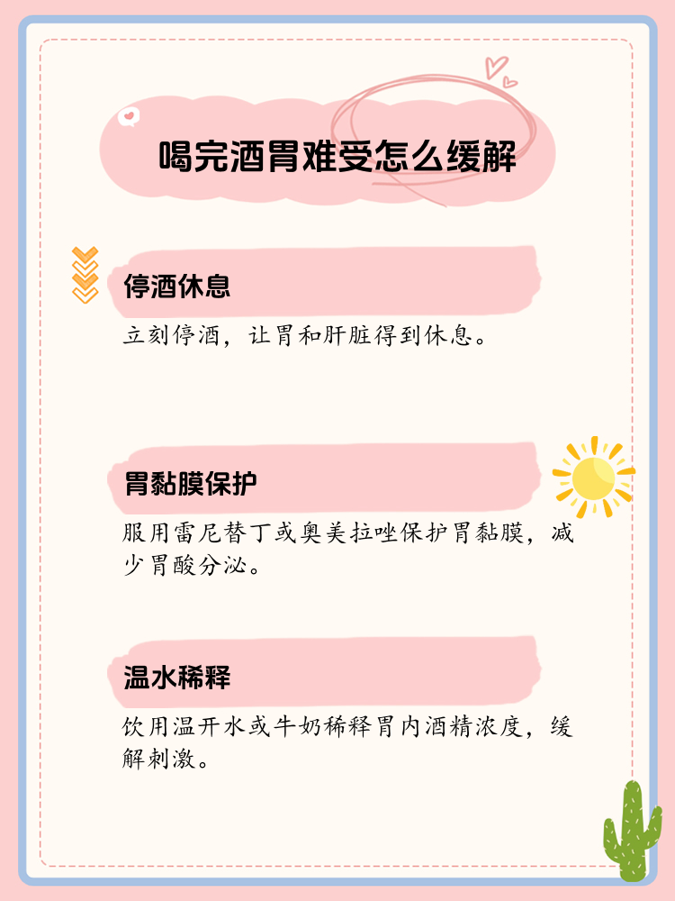 2、喝酒后胃不舒服可采取以下措施缓解1充分休息酒精摄入后,身体需消耗能量代谢毒素,此时休息能让胃肠肝脏等器官减轻负担,通过睡眠或静卧促进体力恢复,加速自我修复避免剧烈运动或过度劳累,防止加重代谢压力2补充水分酒精具有利尿作用,易导致脱水及电解质紊乱分次饮用温水或淡盐水,可稀释胃内酒。