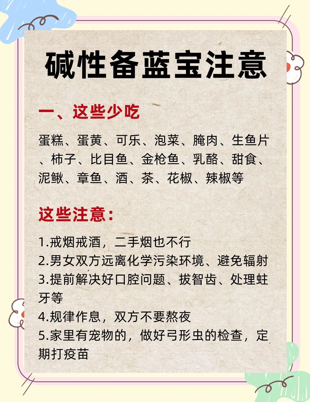 5、想生个可爱的宝宝,真的不只是吃穿那么简单哦!#xF476生男孩的饮食秘诀备孕的妈妈们,孕前一个月开始,多吃些碱性食物含钾纳多的食物,还有高热量咸食和粮食中的根茎类食物,都可能增加生男孩的几率哦!#xF33F碱性食物有哪些?药材如石斛芦根菊花等,水果如猕猴桃柿子桑葚等,还有坚果饮料和蔬菜,都是不错的。