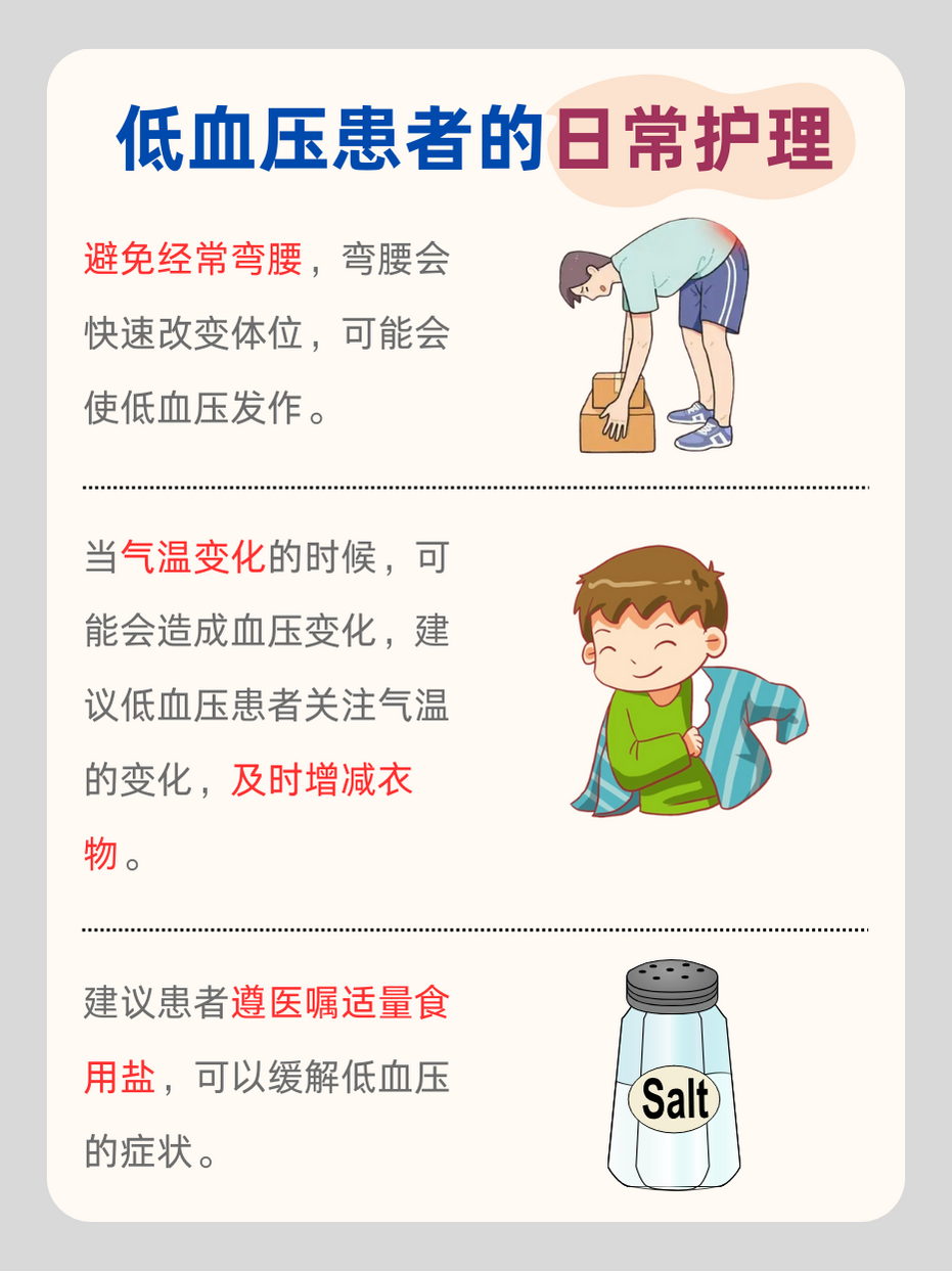 1 生理因素长期低血压可能由先天或体质性因素导致常见于身体瘦弱的老年人女性群体,或与遗传背景相关这类人群的血压偏低通常为生理性表现,一般不会引发明显症状,也无需特殊治疗,但需定期监测血压变化2 体位变化体位性低血压是短期血压骤降的常见原因,表现为从平卧位突然转为直立位,或长时间。