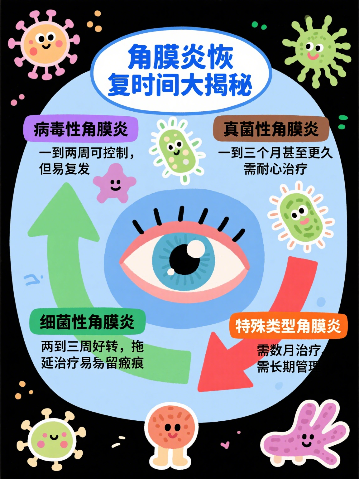 5、急性角膜炎的恢复时间没有固定标准,通常需数天至数月不等,具体取决于以下因素1 病因差异不同病原体细菌病毒真菌或外伤引起的角膜炎恢复周期不同例如,细菌性角膜炎若及时使用抗生素,可能12周内缓解而真菌性角膜炎因治疗难度大,恢复时间可能延长至数周甚至数月2 病情严重程度;病情严重程度是核心影响因素轻度角膜炎多为单纯细菌感染且范围小,规范使用抗生素滴眼液后,角膜修复迅速,通常12周可痊愈中度感染范围扩大或炎症反应明显,如病毒性角膜炎,修复周期延长至24周重度角膜炎若伴角膜溃疡或感染扩散,需数周甚至数月,且可能遗留角膜瘢痕,严重影响视力致病因素的差异。