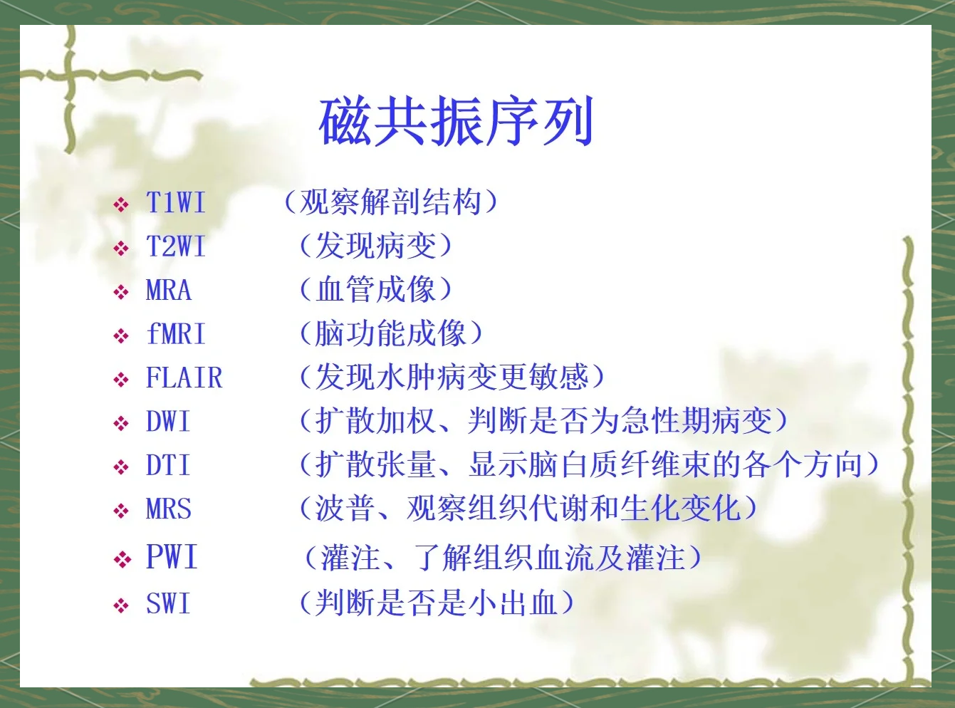 在静磁场中,原子核在特定频率的射频场中吸收能量的现象,是一种由于空间量子化而产生的独特物理现象这些原子核对于特定的辐射频率表现出响应,这种响应是量子力学原理的具体体现在核磁共振现象中,原子核的能级分裂为多个分立的状态,当原子核吸收了与其能级差相匹配的射频能量后,便会跃迁到较高的能级这种现象的产生与原子核的自旋状态密;MRI是一种名为核磁共振的检查仪器,其在医学领域被广泛应用,尤其是在神经系统方面自MRI问世以来,其诊断能力得到了极大的提升,尤其是在颅内肿瘤感染出血梗塞积水血管畸形脊髓和脊柱疾病等疾病的诊断上,其准确性与特异性显著优于CTMRI能够详细显示灰质白质神经核,甚至识别脑神经视。