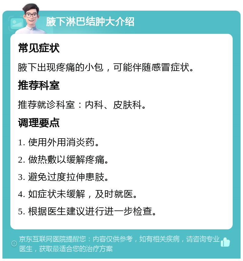 8、针对性治疗根据病因选择抗生素如头孢类控制感染手术切除如皮脂腺囊肿引流或肿瘤切除或物理治疗如红外线照射促进炎症消退4 特殊人群注意事项儿童若出现腋下包块伴高热呼吸急促,需警惕败血症或深部组织感染,需紧急处理预防措施保持个人卫生,避免腋下潮湿环境,减少皮肤破损风险若。