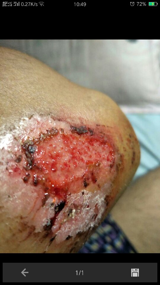 这是正常现象,然后结痂,接着脱落,最后愈合但由于是开放性伤口,极容易引起感染,所以尽量做好预防感染措施伤口局部用双氧水消毒,外捈红汞水,伤口表浅,直径范围小于5cm时一般不需要包扎出现感染时应相配合医生使用抗生素黄水不要洗掉·它会干了自己结成痂,越洗越多的严重的话赶紧去医院看看,夏天很难说的伤口应尽早处理,减小感染几率,实在没办法,等到次日处理。