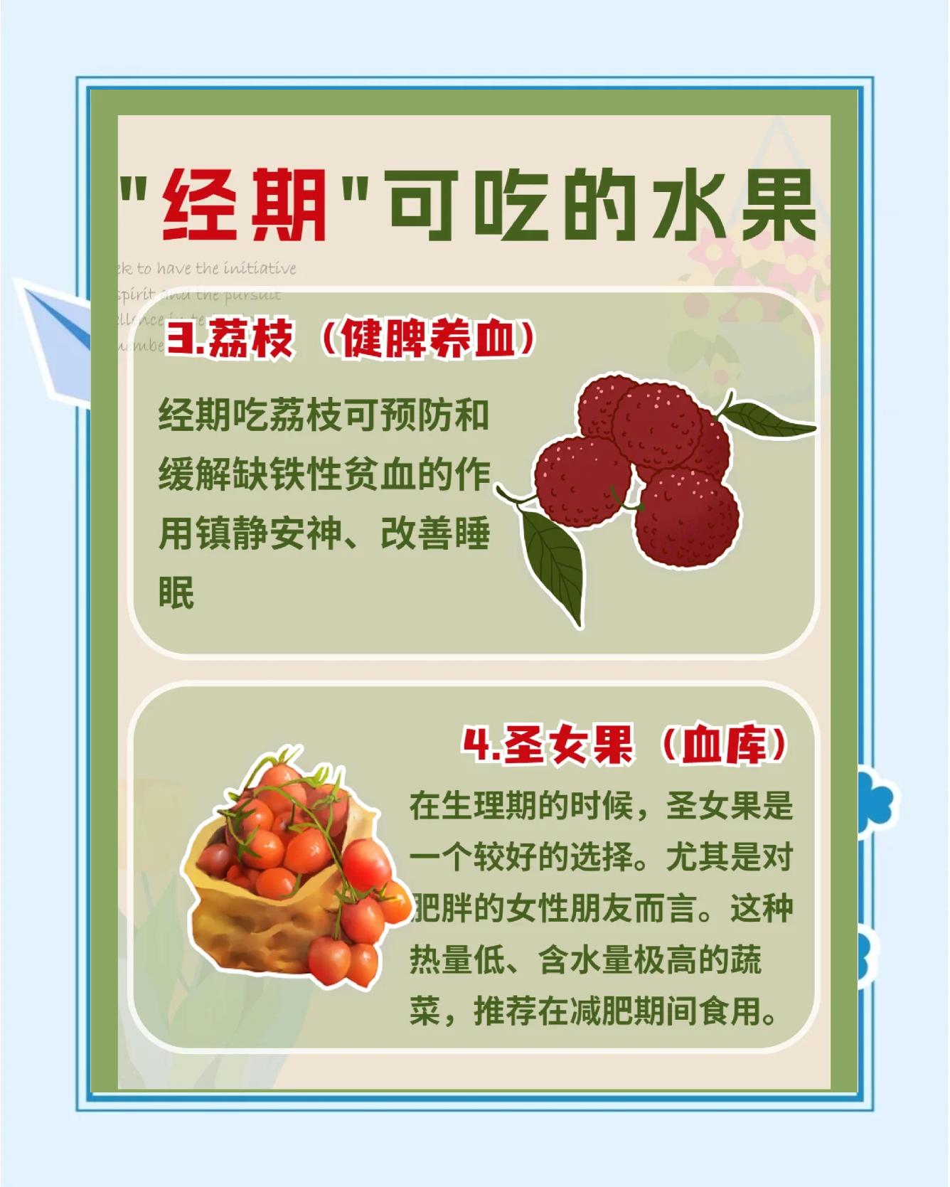 如果胃肠道功能比较好,什么样的水果都可以用,但是要注意量不能过度月经来潮期间可以用红糖姜水,可以缓解盆腔充血,促进盆腔血液循环,有利于经血及时排出,可以改善痛经症状月经来潮期间还能多吃高蛋白的食物,比如鸡蛋大虾排骨鱼等,可以补充蛋白质提高身体抵抗力,另外要注意外阴清洁干燥,注意。
