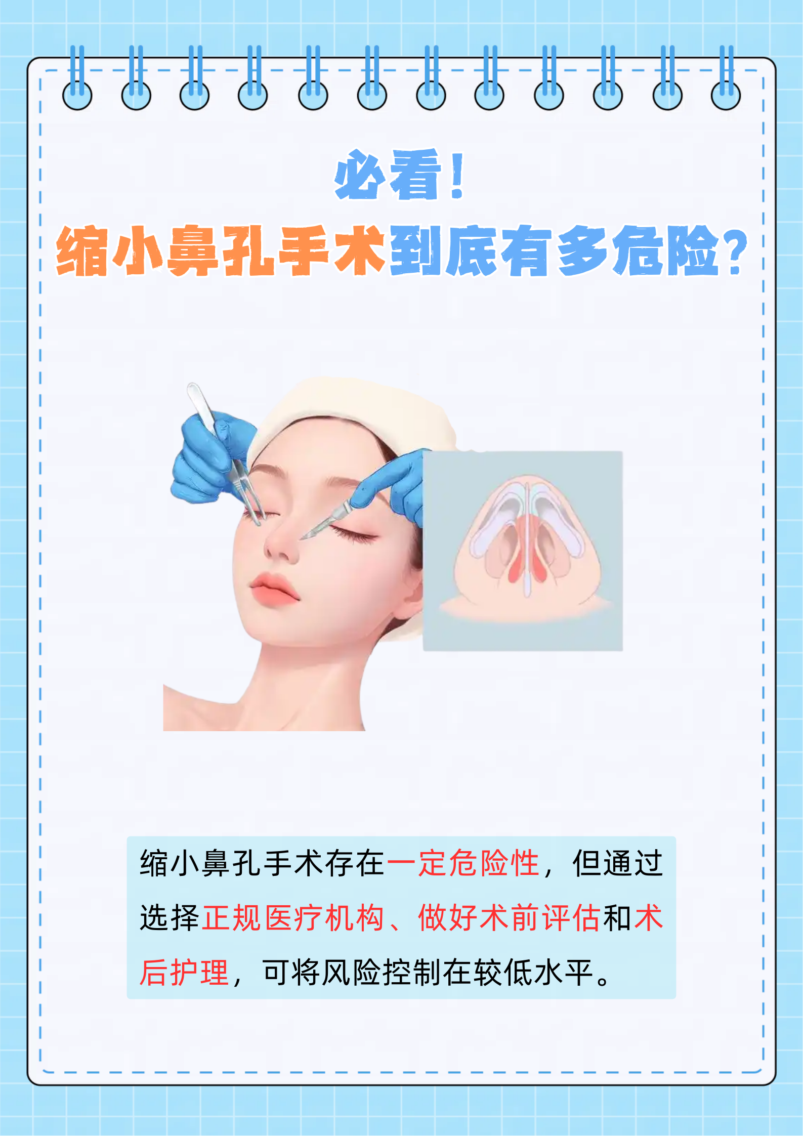缩小鼻翼手术涉及鼻翼缘切口以及鼻翼沟鼻基底的创伤,这些伤口有可能导致出血,进而形成血肿和瘀斑感染风险鼻翼部位的伤口存在感染的可能性,尤其是在术后护理不当或未遵循医嘱进行恢复的情况下瘢痕增生手术过程中取出的组织及其分离部位有可能出现瘢痕增生,这可能会影响手术效果,使鼻尖和鼻翼缩小。