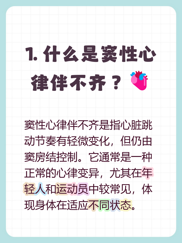 3、窦性心律不齐是窦房结发出的心跳指令节奏异常,导致心跳或快或慢不规则,但通常仍由窦房结主导心律,属于心律失常的一种常见表现,多数情况不严重且可能无症状 以下从产生机制原因类型三个方面展开说明一窦性心律不齐的产生机制正常心脏跳动由“窦房结”主导,它像心脏的“司令部”,每;窦性心律是正常的心脏节律,由窦房结主导的心电活动形成,是心脏健康的标准表现其产生和维持受多种因素影响,具体机制如下1 生理状态下的窦性心律在正常生理状态下,窦房结作为心脏的“天然起搏器”,会以每分钟60100次的频率规律发放电信号,驱动心房和心室收缩这种节律具有稳定性,但会随身体;窦性心律伴偶发性房性早搏是心脏节律的一种常见表现,通常指心脏的窦房结主导心律,但偶尔出现心房异位起搏点提前发放冲动其发生机制与以下因素相关精神紧张当人体处于焦虑压力等精神紧张状态时,交感神经兴奋性增强,促使肾上腺素去甲肾上腺素等激素分泌增加这些激素作用于心脏起搏传导系统,导致。