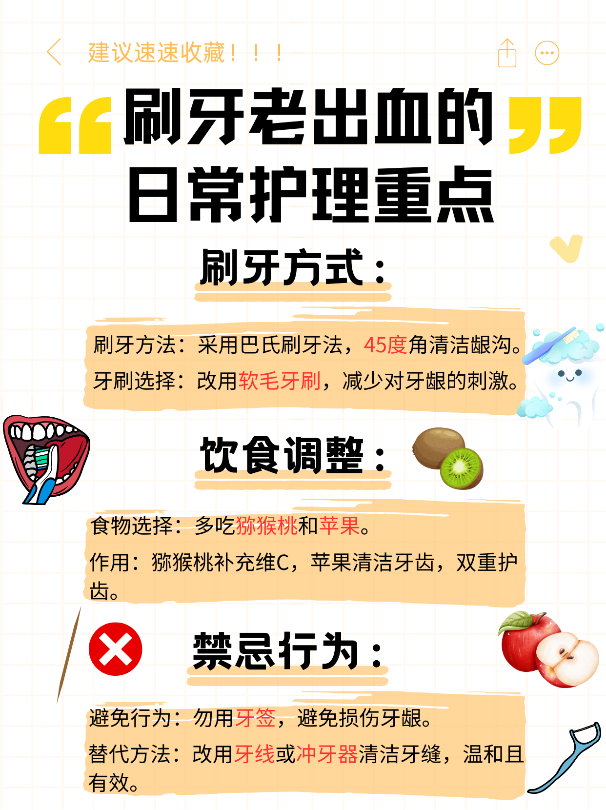 选择合适的牙刷经常牙龈出血的人应选择刷头小软毛牙刷,以更好地呵护牙齿健康轻柔刷牙刷牙时力度要轻,从上到下刷前面的牙齿,对于后面的磨牙也要轻轻伸入刷洗,避免机械式刷牙定期刷牙早晚一定要刷牙,每餐后用清水漱口,防止食物残渣遗留在牙齿表面形成牙结石以上内容介绍了刷牙时牙龈出血的原因及如何正确刷牙,希望能帮助大家更好地维护口腔健康如果出现持续的牙龈。