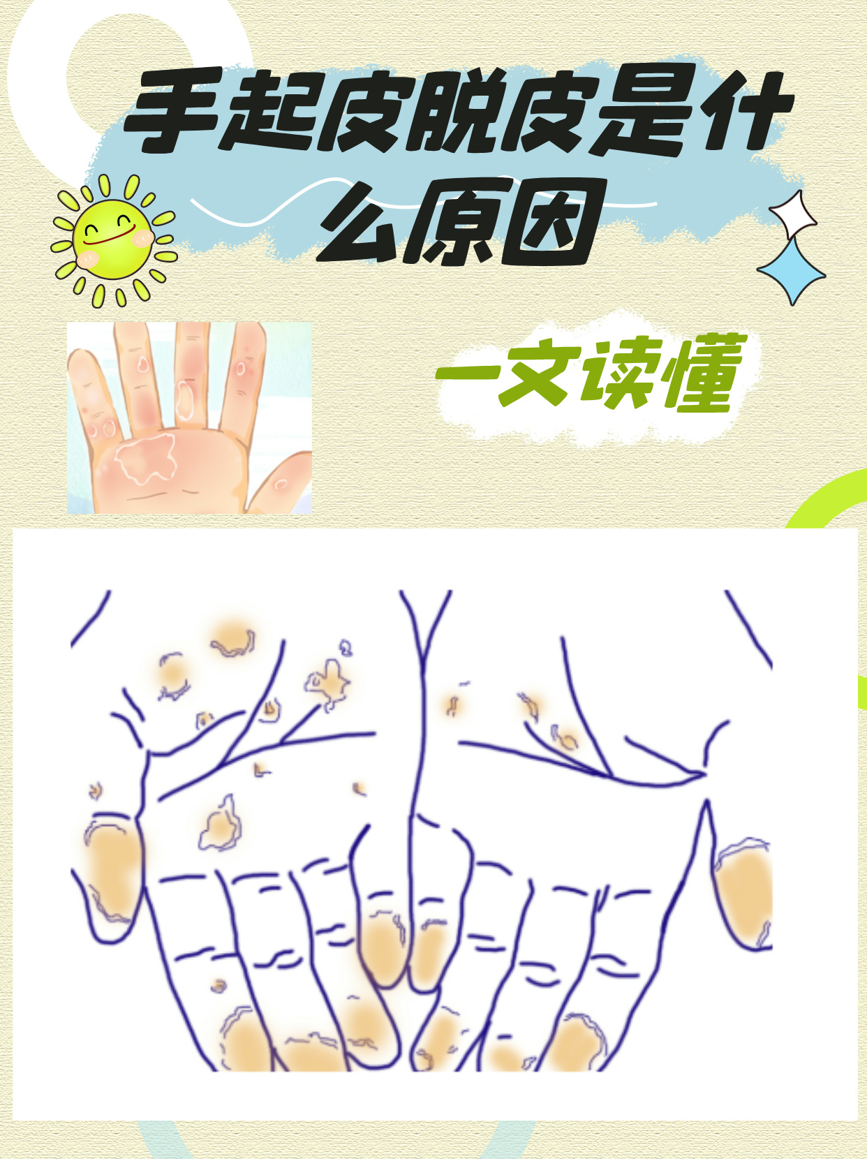 3 接触性皮炎接触刺激性物质如化学溶剂植物汁液或过敏原如镍橡胶后,手指可能出现脱皮瘙痒首要措施是脱离致敏源,用清水冲洗接触部位避免搔抓或热水刺激,可短期使用弱效激素软膏如氢化可的松缓解症状若反复发作,需通过斑贴试验明确过敏原4 维生素缺乏维生素AE或B族缺乏可能。