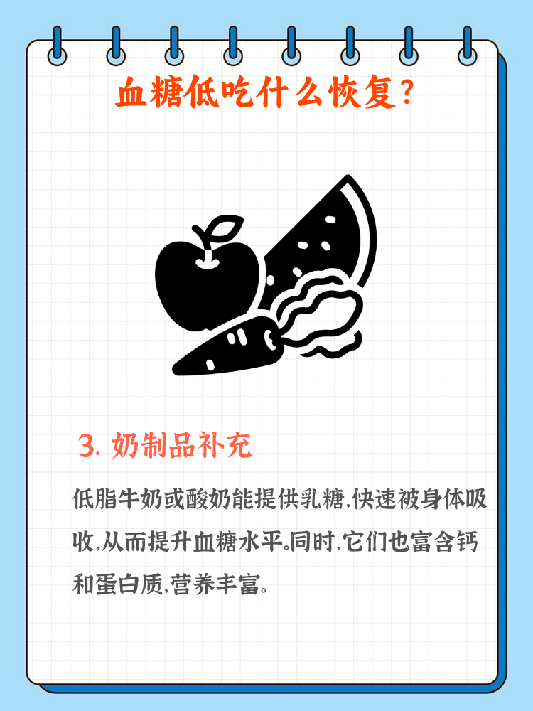 3、一饮食调理选择合适食物 1含糖饮料或食物低血糖急性发作时,应立即摄入糖水果汁蜂蜜糖果或饼干等快速升糖食物这些食物中的单糖或双糖可被肠道快速吸收,通常15分钟内血糖即可回升2复合碳水化合物日常饮食中增加全麦面包糙米燕麦片藜麦等全谷物,或红薯玉米等根茎类蔬菜复。