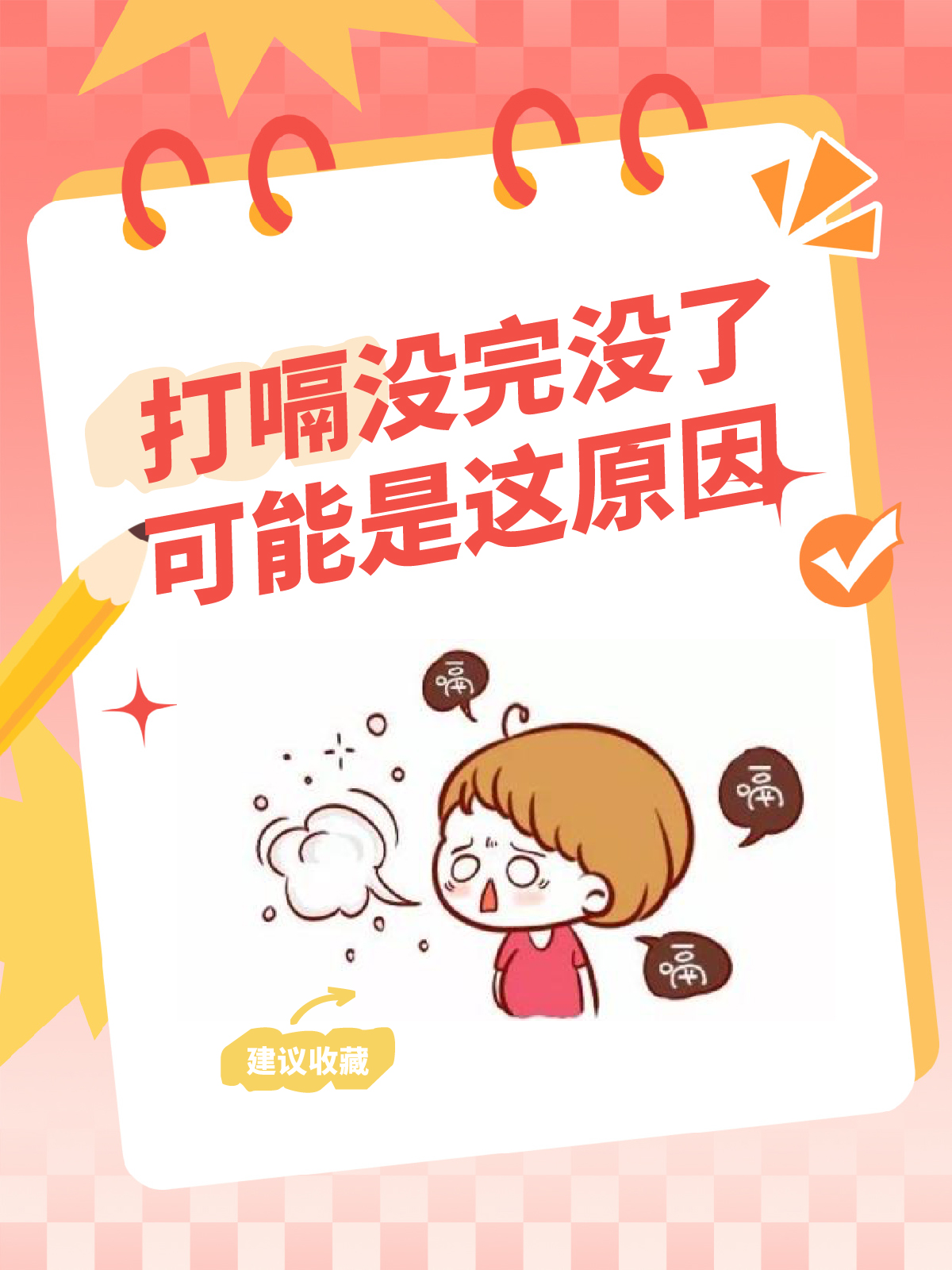 8、老打嗝可能由生理性因素或病理性因素引起,具体原因如下一生理性因素 进食过快或过多快速进食时吞入过量空气,这些空气在胃肠道形成气泡,通过打嗝排出大量进食导致胃容量超负荷,胃壁扩张产生压力,迫使胃内气体上涌,引发打嗝精神紧张紧张状态下呼吸频率加快,吸入更多空气进入胃肠道同时。